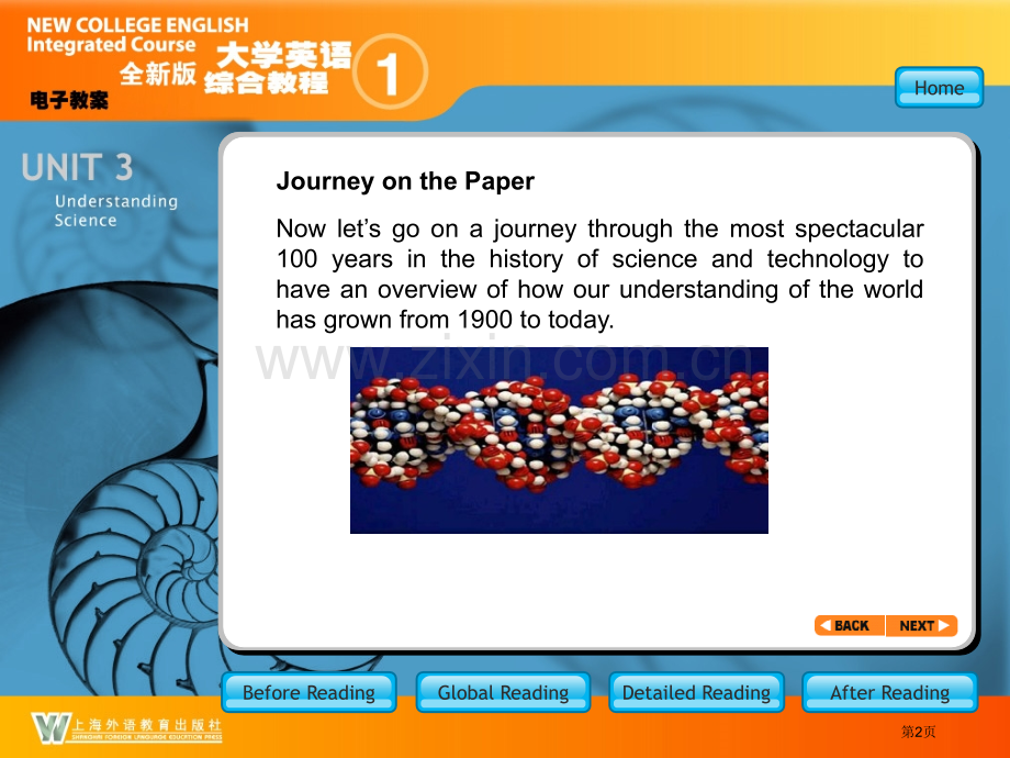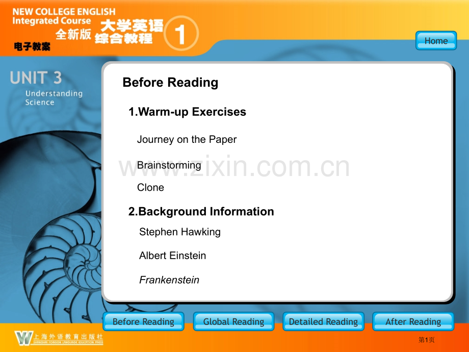 HomeBefore ReadingGlobal ReadingDetailed ReadingAfter ReadingBefore Reading 1.Warm-up Exercises Journey on the Paper Brainstorming Clone2.Background Information Stephen Hawking Albert Einstein Frankenstein BR_Main第1页Journey on the Paper BR_warm_Journey on the Paper Now lets go on a journey through the most spectacular 100 years in the history of science and technology to have an overview of how our understanding of the world has grown from 1900 to today.Before ReadingGlobal ReadingDetailed ReadingAfter ReadingHome第2页1900:MATTERS OF LIFE AND DEATH-Medicine and HealthToday:BR_warm_Journey-MATTERS-Before ReadingGlobal ReadingDetailed ReadingAfter ReadingHomePatients battle illness,while doctors can do little more than counsel(劝说)and comfort them and keep them clean.Doctors treat and often cure patients with a vast array(一大批)of medicines and medical technologies,but some diseases are still incurable.第3页1900:MYSTERIES OF THE UNIVERSE-Physics and Astronomy Today:BR_warm_Journey-MYSTERIESBefore ReadingGlobal ReadingDetailed ReadingAfter ReadingHomeThe Milky Way galaxy(星系)(including some unexplained nebular clouds(星云))is the known universe.Newtons laws explain the physical world.Matter is composed of atoms.The Milky Way is just one galaxy among countless millions we have observed in the universe.There is no set of laws that explains all phenomena in the physical world,although there are many theories.Atoms are composed of many subatomic particles,all of which derive from(来自于)energy.第4页1900:Today:BR_warm_Journey-RESEARCHRESEARCH INTO OURSELVES-Human BehaviorBefore ReadingGlobal ReadingDetailed ReadingAfter ReadingHomeMental illness can be treated with a range of therapies(治疗)and medications.We know a great deal about the chemistry and the parts of the brain that control our behavior and thoughts.There is no cure for the mentally ill,who are confined to insane asylums(精神病院).“Mind”and“body”arethought of as two separate things.第5页1900:The only way to view the Olympic Games in Paris is in person.News about the Games travels to America via(经过)telegraph and is printed in newspapers.Today:BR_warm_Journey-FCBFASTER,CLOSER,BETTER-TechnologyBefore ReadingGlobal ReadingDetailed ReadingAfter ReadingHomeMillions worldwide will watch the Beijing Olympics on television,transmitted instantaneously(瞬间地)by satellite.The news will spread as well by radio,newspaper,and the World Wide Web.第6页1900:There is no good explanation for catastrophic events such as earthquakes.The Earth is thought to be a mere 50 million years old,and the evolution of species is hotly debated.ORIGINS-Earth and Life ScienceToday:BR_warm_Journey-ORIGINSBefore ReadingGlobal ReadingDetailed ReadingAfter ReadingHomeThe plates(板 块)that make up the Earths crust(地 壳)move over time,causing earthquakes and volcanoes.The Earth is known to be 4,500 million years old.The genetic code of DNA,which drives evolution,is better understood every day.第7页BrainstormingBR_warm-Brainstorming-Brainstorm some1.Brainstorm some of the scientific and technological inventions.e-mailmobile phone clone nuclear weapons laptop(笔记本电脑)nanotechnology(纳米技术)genetic engineering Before ReadingGlobal ReadingDetailed ReadingAfter ReadingHome第8页BrainstormingBR_warm_Brainstorming-Discussion 2.Discussion Do all these inventions always change our lives for thebetter?Give examples to explain your opinion.Before ReadingGlobal ReadingDetailed ReadingAfter ReadingHome第9页BR_warm_Clone-new1.newsListen to the three pieces of news about clone.News 2 In April 1998News 1 In Feb.1997 News 3 In Feb.Before ReadingGlobal ReadingDetailed ReadingAfter ReadingHome第10页BR_warm_Clone-new-1 In February 1997 a group of geneticists(遗传学家)led by Ian Wilmut at the Roslin Institute in Edinburgh,Scotland,announced that they had cloned a sheep from the mammary gland tissue(乳腺组织)of a six-year-old ewe(母羊),the first time scientists have been able to clone an adult mammal(哺乳动物).Before ReadingGlobal ReadingDetailed ReadingAfter ReadingHome第11页BR_warm_Clone-new-2 Dolly,the first-ever mammal to be successfully cloned from an adult cell,with her first lamb,named Bonnie,is seen at the Roslin Institute in Edinburgh,Scotland in this image on April 23,1998.Dolly,who was naturally mated at the end of last year with a Welsh Mountain ram(公羊),gave birth to Bonnie on April 13,proving that despite her unusual origins,she is able to breed normally and produce healthy offspring.Before ReadingGlobal ReadingDetailed ReadingAfter ReadingHome第12页BR_warm_Clone-new-3 Dolly,the sheep,the first mammal to be successfully cloned from an adult cell,has been put down after she was found to have a lung disease,the Roslin Institute in Scotlands capital Edinburgh s a i d o n F e b 1 7,.“She was suffering from an incurable disease,”said Dr Harry Griffin,after Roslin released a statement saying the decision had been taken to put Dolly down after she contracted(感染)progressive lung disease.-Before ReadingGlobal ReadingDetailed ReadingAfter ReadingHome第13页BR_warm_Clone-Discussion 2.Discussion What is your attitude towards clone?Clone is a member of a group of organisms or plants produced non-sexually from one ancestor.The suggested ethical and practical arguments both for and against cloning:For:Close1.Animals from endangered species could be 2.cloned to prevent extinction.2.Cloning would be a good source for organ and bone marrow(骨髓)transplants.3.Sterile(不育)couples will be able to have offspring who will have either the mothers or fathers genetic pattern.1.Technology is not well developed.It has a low fertility rate(出生率).In cloning Dolly,277 eggs were used,30 started to divide,nine induced pregnancy,and only one survived to term(临产).2.Clones may be treated as second-class citizens and the unknown psychosocial harm with impacts on the family and society.3.Loss of geneti