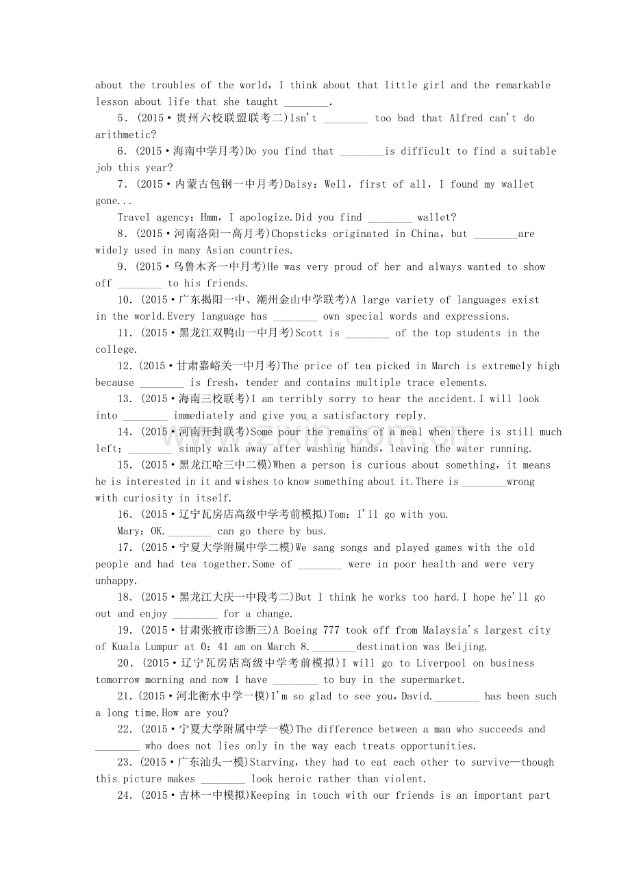 6.(2015·海南中学月考)Do you find that ________is difficult to find a suitable job this year?