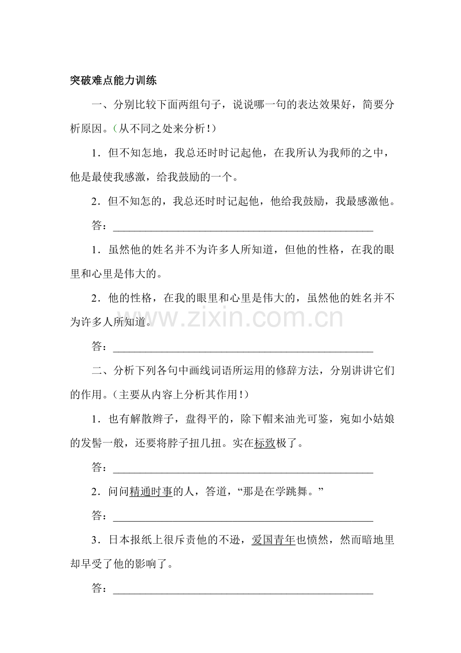 一、第一组:第一句的表达效果好。“在我所认为我师的之中”强调了在自己心目中的位置。“他是最使我感激,给我鼓励的一个”强调了先生对自己的鼓励非别的人所能比,因此对他的感激最为强烈。