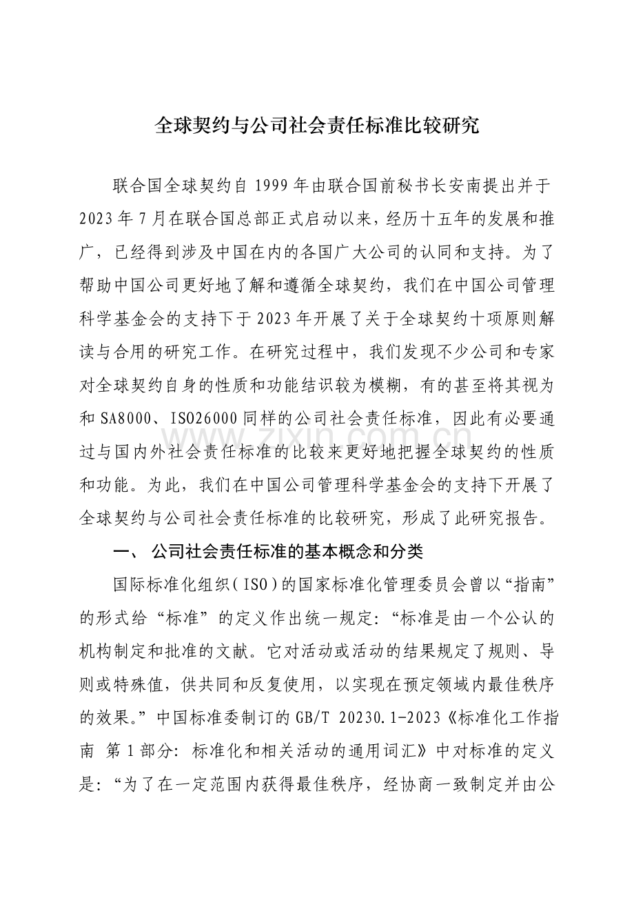 联合国全球契约自1999年由联合国前秘书长安南提出并于2023年7月在联合国总部正式启动以来,经历十五年的发展和推广,已经得到涉及中国在内的各国广大公司的认同和支持。为了帮助中国公司更好地了解和遵循全球契约,我们在中国公司管理科学基金会的支持下于2023年开展了关于全球契约十项原则解读与合用的研究工作。在研究过程中,我们发现不少公司和专家对全球契约自身的性质和功能结识较为模糊,有的甚至将其视为和SA8000、ISO26000同样的公司社会责任标准,因此有必要通过与国内外社会责任标准的比较来更好地把握全球契约的性质和功能。为此,我们在中国公司管理科学基金会的支持下开展了全球契约与公司社会责任标准的比较研究,形成了此研究报告。