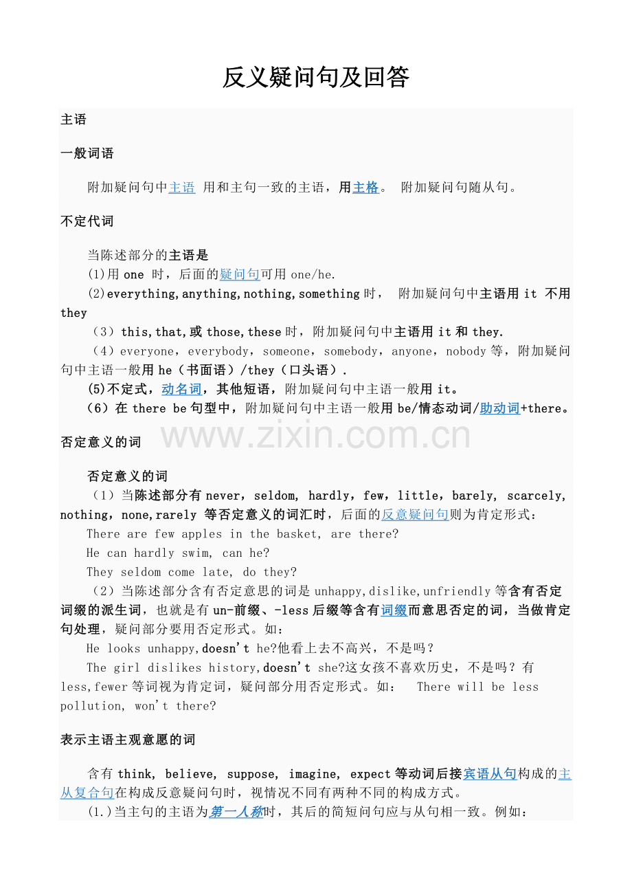 (2)当陈述部分含有否定意思的词是unhappy,dislike,unfriendly等含有否定词缀的派生词,也就是有un-前缀、-less后缀等含有词缀而意思否定的词,当做肯定句处理,疑问部分要用否定形式。如: