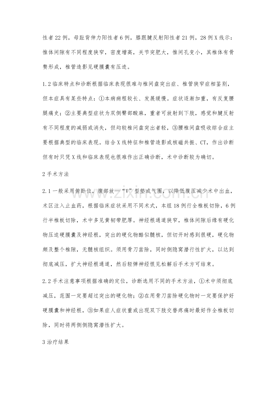 2.1一般采用俯卧位,腹部放—“V”型垫或气圈,以降低腹压减少术中出血,术区注入止血药,根据临床症状采用不同术式,本组18例行全椎板切除,6例行半椎板切除,术中多见黄韧带肥厚。神经根通道狭窄,椎体间隙后缘有硬化物压迫硬膜囊及神经根,突出的硬化物酷似髓核,但切开时感到很硬,硬化物颇及整个椎隙,无髓核组织。须用骨刀凿除,同时侧隐窝潜行性扩大,以达到彻底减压,扩大神经根通道,然后轻弹神经恨见松解后手术方可结束。