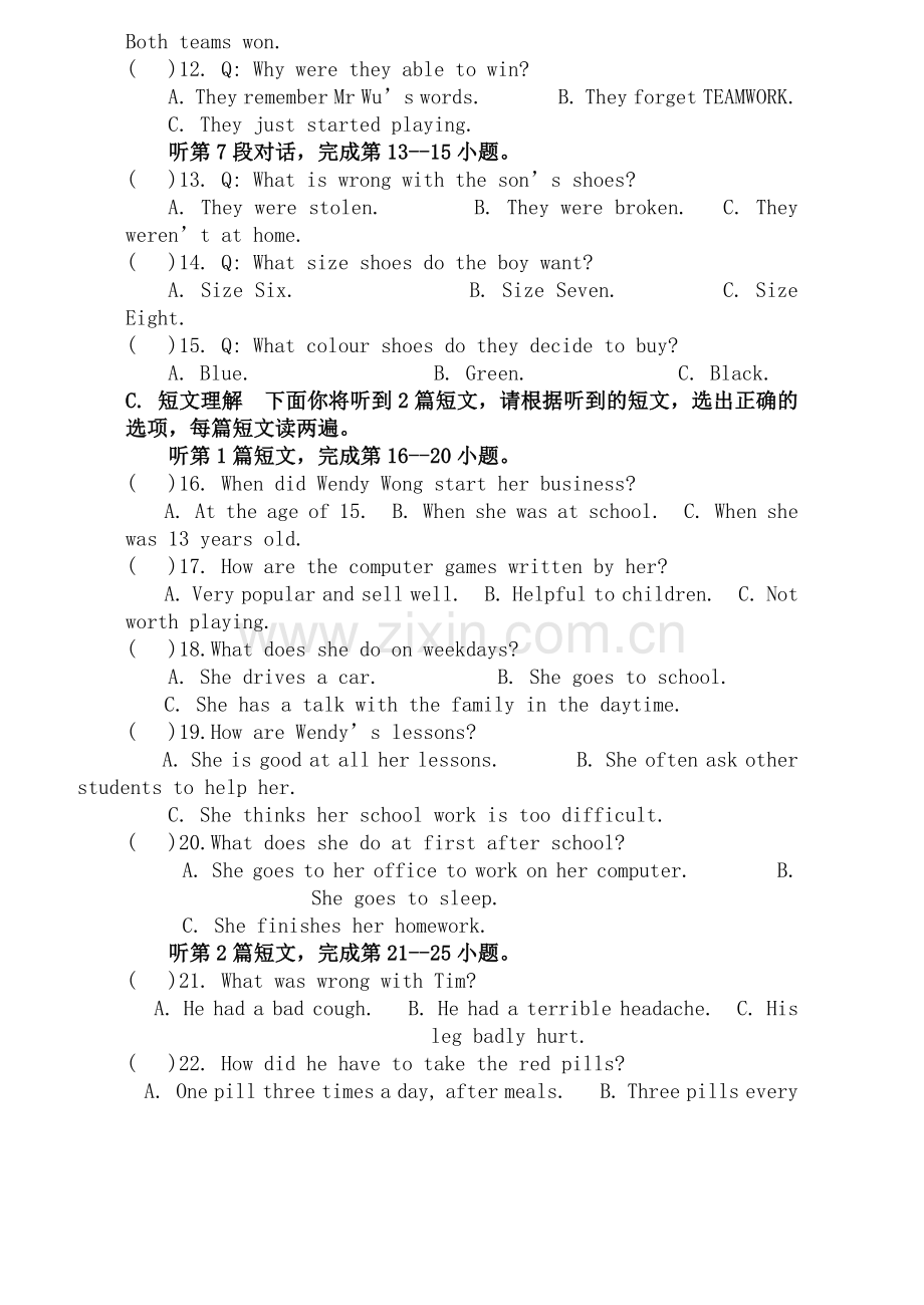 C. 短文理解 下面你将听到2篇短文,请根据听到的短文,选出正确的选项,每篇短文读两遍。