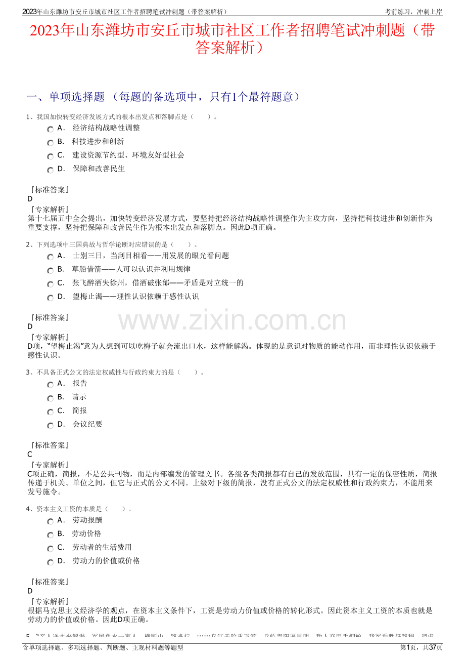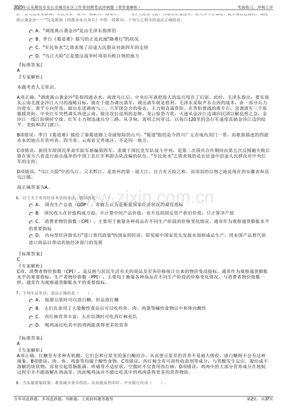 2023年山东潍坊市安丘市城市社区工作者招聘笔试冲刺题(带答案解析)一、单项选择题(每题的备选项中,只有1个最符题意)1、我国加快转变经济发展方式的根本出发点和落脚点是()。A 经济结构战略性调整 B 科技进步和创新 C 建设资源节约型、环境友好型社会 D 保障和改善民生标准答案D专家解析第十七届五中全会提出,加快转变经济发展方式,要坚持把经济结构战略性调整作为主攻方向,坚持把科技进步和创新作为重要支撑,坚持把保障和改善民生作为根本出发点和落脚点。因此D项正确。2、下列选项中三国典故与哲学论断对应错误的是()。A 士别三日,当刮目相看用发展的眼光看问题 B 草船借箭人可以认识并利用规律 C 张飞醉酒失徐州,借酒破张邰矛盾是对立统一的 D 望梅止渴理性认识依赖于感性认识标准答案D专家解析D项,“望梅止渴”意为人想到可以吃梅子就会流出口水,这样能解渴。体现的是意识对物质的能动作用,而非理性认识依赖于感性认识。3、不具备正式公文的法定权威性与行政约束力的是()。A 报告 B 请示 C 简报 D 会议纪要标准答案C专家解析C项正确,简报,不是公共刊物,而是内部编发的管理文书。各级各类简报都有自己的发放范围,具有一定的保密性质,简报传递于机关、单位之间,但它与正式的公文不同。上级对下级的简报,没有正式公文的法定权威性和行政约束力,不能用来发号施令。4、资本主义工资的本质是()。A 劳动报酬 B 劳动价格 C 劳动者的生活费用 D 劳动力的价值或价格标准答案D专家解析根据马克思主义经济学的观点,在资本主义条件下,工资是劳动力价值或价格的转化形式。因此资本主义工资的本质也就是劳动力的价值或价格。因此D项正确。5、“亲人送水来解渴,军民鱼水一家人。横断山,路难行。乌江天险重飞渡,兵临贵阳逼昆明。敌人弃甲丢烟枪,我军乘胜赶路程。调虎2023年山东潍坊市安丘市城市社区工作者招聘笔试冲刺题(带答案解析)考前练习,冲刺上岸含单项选择题、多项选择题、判断题、主观材料题等题型第1页,共37页5、“亲人送水来解渴,军民鱼水一家人。横断山,路难行。乌江天险重飞渡,兵临贵阳逼昆明。敌人弃甲丢烟枪,我军乘胜赶路程。调虎离山袭金沙”这是歌曲四渡赤水出奇兵中的一段歌词,下列与之相关的说法正确的是:A“调虎离山袭金沙”是由毛泽东指挥的 B李白蜀道难描写的正是此地“路难行”的状况 C“军民鱼水”之情表现了沿途人民群众对新四军的支持 D“乌江天险”正是楚汉战争时项羽兵败自刎的地方标准答案A专家解析本题考查人文常识。A项正确,“调虎离山袭金沙”是指四渡赤水,南渡乌江后,中央红军就把敌人的追兵甩在了后面。此时,毛泽东指出:要实现从云南北渡金沙江入川的战略目标,就在于能否调出滇军,调出滇军就是胜利。毛泽东采取声东击西的战术,命一部分兵力向瓮安、黄平方向佯攻,做出东进湖南与二、六军团会合的姿态,主力则直逼贵阳。在贵阳督战的蒋介石,急调滇军三个旅驰援贵阳,中央红军突然调头西进云南,做出攻打昆明的态势。龙云惊恐万状,火速从金沙江边调回民团以解昆明之急,金沙江一线江防顿时空虚,红军主力则迅速兵分三路,从寻甸、嵩明之间穿过,以每日120里的急行军速度直插金沙江边的皎平、龙街和洪门渡口。B项错误,李白蜀道难描绘了秦蜀道路上奇丽惊险的山川,“蜀道”指的是今四川广元市境内剑门一带。而歌曲描述的四渡赤水的地点在贵州省、四川省、云南省交界地区,不是同一地方。C项错误,新四军即国民革命军陆军新编第四军,隶属于国民党军队战斗序列,是第二次国共合作期间由第五次反围剿失败后留在南方八省进行游击战争的中国工农红军和游击队改编的队伍。“军民鱼水”之情表现的是长征途中沿途人民群众对中央红军的支持。D项错误,“乌江天险”中的乌江,又名黔江,是贵州的第一道大江,自古有天险之称。而项羽的自刎之地是现在的安徽省和县乌江镇。故正确答案为A。6、以下关于常用经济术语的说法,错误的是()。A 国内生产总值(GDP),常被公认为是衡量国家经济状况的最佳指标 B 国民收入在价值构成方面,不计算中间产品价值,也不包括固定资产折旧价值,只计算净产值 C 消费者物价指数(CPI),主要用于衡量各种商品在不同生产阶段的价格变化情况,通常作为观察通货膨胀水平的重要指标 D 内向型经济指实行“进口替代政策”的国家的经济,即发展中国家优先发展本国制成品生产,用本国产品替代原进口商品以带动其他经济部门的发展标准答案C专家解析C项,消费者物价指数(CPI),是反映与居民生活有关的商品及劳务价格统计出来的物价变动指标,通常作为观察通货膨胀水平的重要指标;生产者物价指数(PPI),主要用于衡量各种商品在不同生产阶段的价格变化情况,与消费者物价指数一样,通常作为观察通货膨胀水平的重要指标。7、下列生活常识,说法正确的是()。A 做甜豆浆时可以放白糖,但忌放红糖 B 人们在食用了大量酸性食品后可以吃些鱼、肉、鸡蛋等碱性食物以中和体内酸性 C 西红柿营养丰富,人在饥饿时可吃西红柿充饥 D 喝鸡汤比吃其中的鸡肉能获得更多的营养标准答案A专家解析A项正确,红糖里有多种有机酸,它们会和豆浆里的蛋白酶结合,从而使豆浆里的营养不易被人吸收,放白糖则不会有这种现象。B项错误,肉