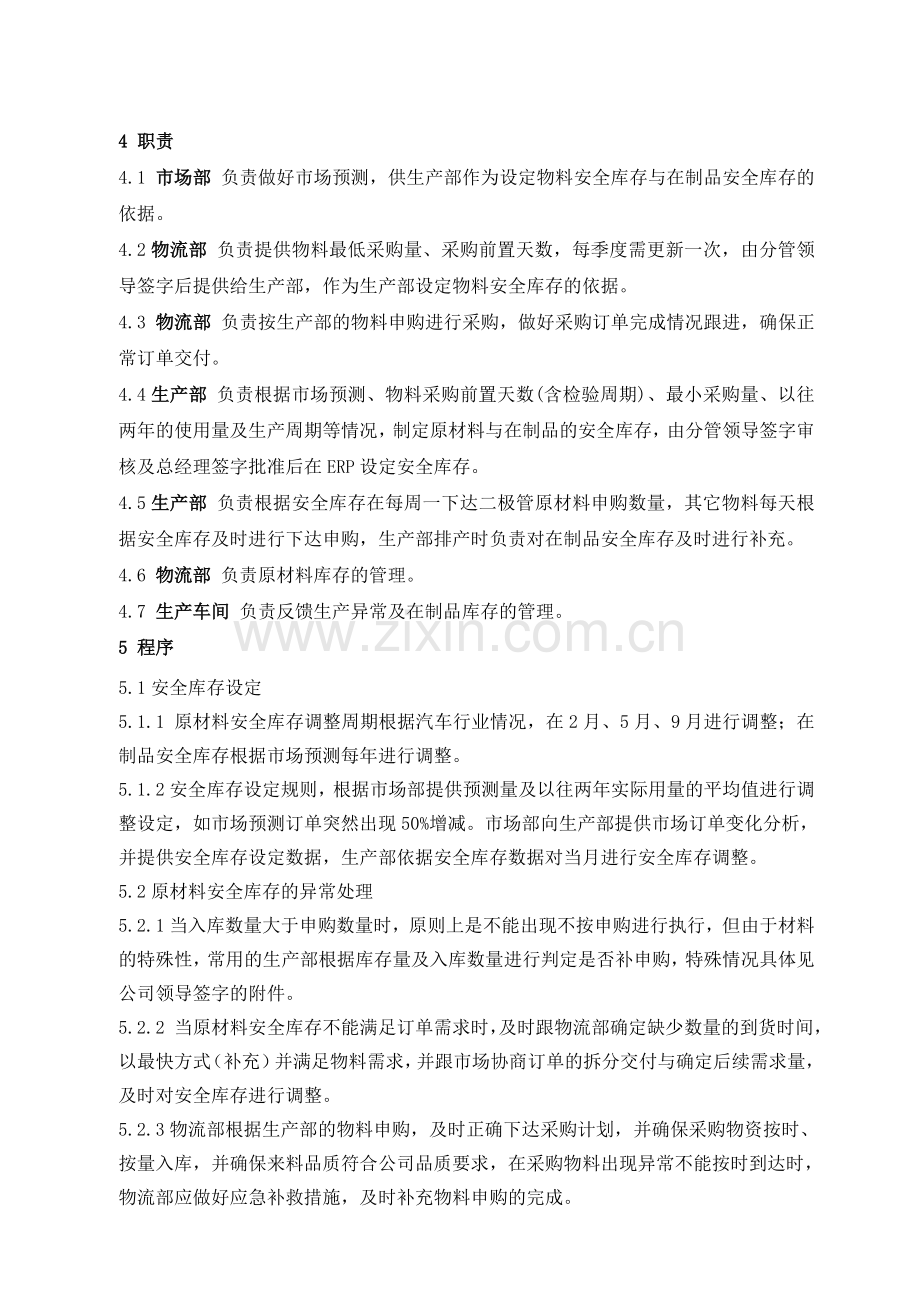 4.4生产部 负责根据市场预测、物料采购前置天数(含检验周期)、最小采购量、以往两年的使用量及生产周期等情况,制定原材料与在制品的安全库存,由分管领导签字审核及总经理签字批准后在ERP设定安全库存。