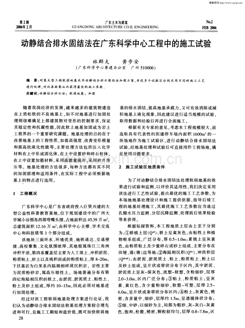 第2 期 2 0 o 6 年2 月 广东土 木与 建筑 GUANGDON G ARCHI T E C TUR E CI VI L ENGI N EER I NG N 0 . 2 F E B 2 0 0 6 动静结合排水固结法在广东科学中心工程中的施工试验 林群夫 黄步安 ( 广 东科 学 中心筹 建 办公 室 广 州 5 1 0 0 0 6 ) 摘要 : 对某大型工程软弱地基采 用动静 结合排 水固结法加 固方案. 并设 多个试验 区分别采用不 同的施 工工艺 进行处理 . 对 比其效果从而获得最优 的施 工参数 , 关 键 词 : 动 静 结合 排 水 法 ;软 弱 地 基 ;加 固 随着我 国经济 的发展 , 越来越多的建筑物建造 在土质松软 的不 良地基上 . 如不对地基进行加 固处 理则很难满足上部建筑物对变形的控制要求 . 保证 其稳定性和抗震性能 , 因此软 土地基加固成为岩土 工程界的一个重要研究课题。地基处理的 目的在于 改善地基土的工程性质 。 如提高强度 、 改善变形模量 和提高抗液化性 能等. 主要处理方法包括注入化学 材料在土中形成固化体 . 在土中设置砂和碎石桩体 . 在土中设置加筋材料 。 采用高能量强夯 . 采用砂井预 压等。地基处理 的方法很多 . 每种方法都有其不同 的加固原理和适用条件 . 在实际工程中必须根据地 基土 的特点进行选用。 1工程概 况 广东科学中心是广东省政府投入巨资兴建的大 型公益性科普教育基地 . 位于规划建设中的广州大 学城小谷围岛西部弯嘴头围. 占地面积达 4 5 . 3 9万 m , 总建筑面积 l 2 . 1 6万 m , 由科学中心主楼 、 学术交 流 中心和科技塔等 3 个部分组成。 该地块三面环水 、 环境优美 、 地铁通达 、 交通便 捷 、 高校聚集 、 文化氛 围浓厚 , 其地貌属珠江三角洲 冲积平原 . 第四系覆盖层主要为人工填土、 冲积淤泥、 粉质粘土、 砂土以及残积而成的粉质粘土, 厚 8 - 2 0 m, 下伏基岩为白垩系 内陆湖相碎屑沉积岩 ,岩性主要 为泥质粉砂岩 。 属高压缩性土。场地普遍分布有第 四纪海陆相沉积的软土。 由淤泥 、 淤泥质土、 粘性土 、 粉土及砂土组成 。 厚约 1 0 ~ 1 5 m, 因此必须对地基进 行加 固处 理 。 经过对该工程软弱地基处理方案进行论证 , 我 们认为动静结合排水 固结法软基处理方案较合理先 进和可行 。 且施工工期短和造价低 。 既可加快软弱地 2 8 基 的排水固结 , 提高地基承载力 , 又可有效消除或减 轻地基土液化现象, 因此建议进行适 当规模的试验 . 取得 数 据和经 验后 再进 行 全面施 工 。 根据有关专家的意见, 考虑本工程规模较大 . 故 选取具有代表性 的拟建停车场 内面积 1 6 0 0 m 的一 块场地作为施工试验区 。 进行动静结合排水固结法 试验, 经地基处理和试验后可直接用作工程场地 . 满 足使用功能要求。 2施工试 验 区地质 条 件 为了对动静结合排水 固结法处理软弱地基的效 果进行试验和监测 . 以评价其适用性 . 我们决定采用 该法进行工艺性试验 . 提出最优的施工工艺参数 。 为 本场地地基处理设计和施工提供依据 , 指导后续工 程的地基处理施工 . 其最优施工工艺参数应 当通过 孔隙水压力监测 、 分层沉降监测 、 处理前后效果检验 等来获得。 根据钻探资料 。 本工程地质 土层 由上至下分别 为: ①耕植土层( Q ) : 耕土呈黄灰色, 由粘性土和植 物根系组成 。 广泛分布 , 厚 O . 5 ~ 1 . 0 m; 素填土呈灰黄 色 。 由粉质粘土及少量碎石或砂土组成 , 主要分布在 田埂、 涌( 塘) 边等地; ②海陆相沉积( Q ) 、 冲洪积层 ( Q ) : 由淤泥 、 淤 泥质土 、 粘土 、 粉质粘土 、 粉土 以 及砂土组成 . 呈片状或带状分布于区内, 其 中淤泥 、 淤泥质土呈灰~ 深灰色 , 流塑~ 软塑 , 含粉细砂 , 层厚 2 .0 3 .0 m。 区内广泛分布; ③粘土 、 粉质粘土: 呈灰 黄 、 黄 红 色 , 含 少 量 粉 细 砂 , 软 塑 ~ 可 塑 , 层 厚 2 . 5 ~ 6 .0 m。 呈片状或条带状分布区内; ④粉土: 灰黄色, 稍 密 , 含多量 中、 细砂 , 层厚约 1 . 5 m, 呈透镜体状分布 ; ⑤细、 中砂: 以细砂为主, 局部为粗砂, 灰~ 灰白~ 灰黄 色 , 饱和 , 松散 , 稍密, 颗粒较均匀, 层厚 0 . 8 ~ 7 . 8 m, 区 维普资讯 2 o 0 6 年2 月 第2 期 林群 夫等: 动静 结合排 水固结法 在广东 科学中 心工程中 的施 工试验 F E B 2 O O 6 N o . 2 内广泛分布; ⑥残积层( Q ) : 由泥质粉砂岩风化而 成 , 含粉质粘土和粘土, 呈褐红色 。 按其稠度可分为 可塑 、 硬塑 和 坚 硬 层 , 层 面埋 深 8 . 3 1 5 . 9 m。 层 厚 0 9 . 0 m, 广泛分布 ; ⑦基岩 : 为白垩系下统 白鹤洞组泥 质粉砂岩( K b ) , 埋藏较深 , 褐红 褐色。 按风化程度 划分如下: ⑦一 1 为全风化岩。 岩芯呈坚硬土状. 层面 埋深 1 4 .0 ~ 2 0 .9 m; ⑦一 2为强风化岩, 岩芯呈坚硬土、 碎屑或半岩半土状, 层面埋深 1 3 . 8 2 4 .9 m; ⑦一 3为 中风化岩, 泥质、 泥钙质胶结。 裂隙发育 。 岩芯呈短柱 或碎块状, 层面埋深 1 3 .4 — 3 6 .0 m; ⑦一 4为微风化岩, 岩 芯完 整 , 呈 柱或短 柱 状 。 钙 质胶 结 。 地下水类型属第四系覆盖层孔隙性潜水为主 . 下覆基岩属软质岩类 , 基岩裂隙水水量不大 . 区内地 下水位埋深较浅 。 一般在 0 . 5 m内。 3动静结合排水固结法软基处理原理 动静结合排水固结法是在软弱地基中设置一套 适应软粘土动力 固结加 固的有效排水系统 , 采用适 应软粘土地基的“ 先轻后重 、 逐级加能 、 少击多遍 、 逐 层加固” 的夯击方式 。 确立 以不破坏土体宏观结构为 原则的收锤标准 。 形成能有效抑制孔压上升 . 加速孔 压消散 , 增强