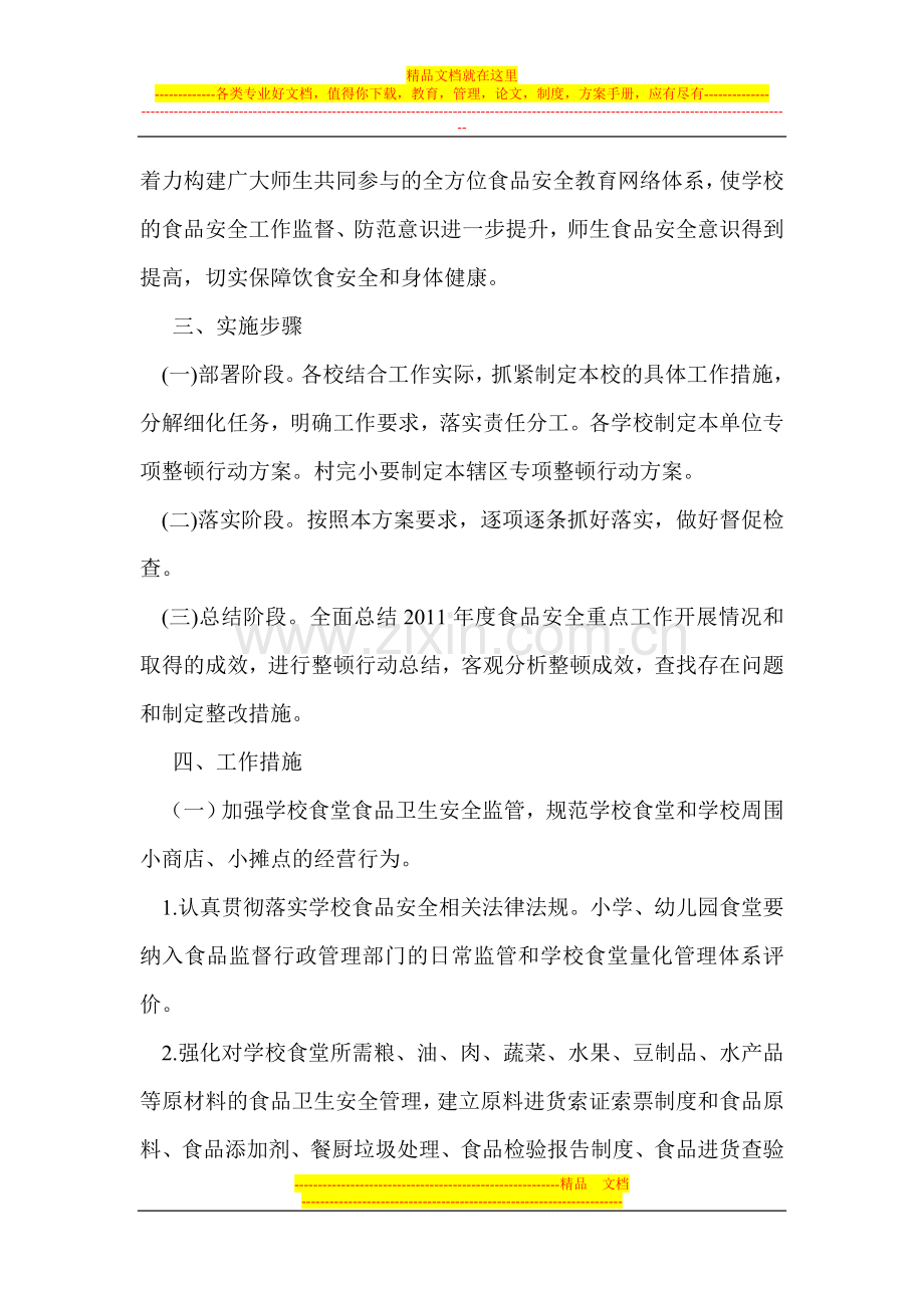 为贯彻落实国务院食品安全委员会第三次全体会议和《国务院办公厅关于印发2011年食品安全重点工作安排的通知》(国办发〔2011〕12号)精神,全面整治学校食品生产经营行为,切实保障广大师生身体健康和生命安全,特制定本方案。