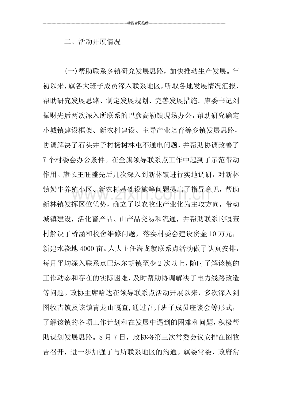 按照《中共##盟委、行政公署关于在盟级领导干部、旗县市四大班子成员中建立联系点制度的实施意见》要求,##旗深入开展了领导联系点活动,积极拓展旗领导包乡、重点项目专项推进、旗领导联系重点企业等制度的活动内容,强化组织、周密部署,全旗20名四大班子主要领导同志以活动为载体,积极深入基层,切实帮助基层解决生产生活及发展中存在的问题,真诚倾听群众呼声,真心关注群众疾苦,开展调查研究,总结经验,以点带面来指导全旗工作,搭建了谋发展、促发展的平台,有效地推动了和谐社会建设。现将##旗四大班子成员贯彻落实联系点制度工作开展情况总结如下: