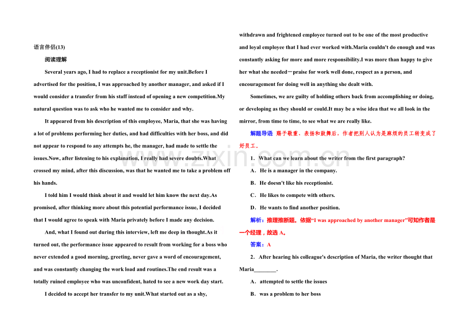 解析:细节理解题。依据其次段“Maria, that she was having a lot of problems performing her duties, and had difficulties with her boss”,故选B。