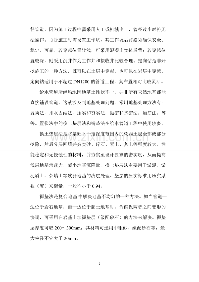 给水管道所经场地因地基土性状不一,并非所有天然地基都能直接铺设管道,这就涉及到地基处理问题。常用地基处理方法有:置换法,排水固结法,压实和夯实法,振密和挤密法,加筋法,等等。置换法中的换土垫层法和褥垫法在给水管道工程中使用较多。