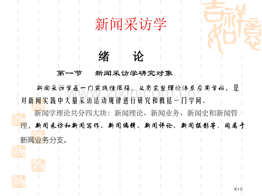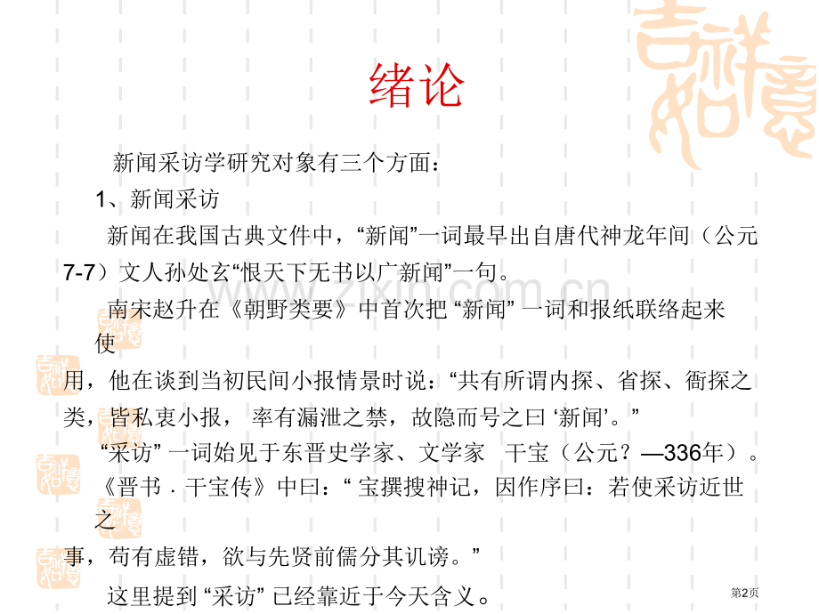 新闻采访学绪绪论论第一节新闻采访学研究对象新闻采访学是一门实践性很强、又有完整理论体系应用学科,是对新闻实践中大量采访活动规律进行研究和概括一门学问。新闻学理论共分四大块:新闻理论、新闻业务、新闻史和新闻管理,新闻采访和新闻写作、新闻编辑、新闻评论、新闻摄影等,同属于新闻业务分支。第1页绪论新闻采访学研究对象有三个方面:1、新闻采访新闻在我国古典文件中,“新闻”一词最早出自唐代神龙年间(公元7-7)文人孙处玄“恨天下无书以广新闻”一句。南宋赵升在朝野类要中首次把“新闻”一词和报纸联络起来使用,他在谈到当初民间小报情景时说:“共有所谓内探、省探、衙探之类,皆私衷小报,率有漏泄之禁,故隐而号之曰新闻。”“采访”一词始见于东晋史学家、文学家干宝(公元?336年)。晋书干宝传中曰:“宝撰搜神记,因作序曰:若使采访近世之事,苟有虚错,欲与先贤前儒分其讥谤。”这里提到“采访”已经靠近于今天含义。第2页绪论“新闻”与“采访”合为词组使用,是在我国近代报刊出现以后。如申报创建(1872、4、30)后一月,登载广告向社会征集新闻,广告名称就是新闻采访启。其中“采访”已经专指新闻采访。2、记者新闻采访活动新闻采访学是指导记者采访新闻学问,其基本理论来自于记者采访实践,是记者采访活动规律总结。通讯员采访活动不纳入研究范围。第3页绪论但是总结出规律具有广泛性,同样可以指导通信员采访。3、记者采访规律它深入研究新闻采集方式、方法、技巧类问题,是这门学科特色。除此之外,还研究采访原理和基本规律一类问题,而且注重揭示其规律性。第二节新闻采访学研究历史综述萌芽于近代报刊时期,主要见于著名报人、记者论述新闻问题和别涉及到多方面问题。例如:第4页绪论梁启超(1873-1929)19为时报创刊写发刊词中,提出了新闻报道一些标准。黄远生(1885-1915)19在忏悔录文中提到记者“四能”(能想、能走、能听、能写)。以上叙述,既是经验之谈,也是对新闻采访写理论思索,谈出了不少规律性东西。对新闻采访系统研究开始于19,今后可分为三个时期:第5页绪论1、“五四”时期19,北京大学聘邵飘萍为导师,讲授新闻采访,1923年将其讲稿出版,名为实际应用新闻学(又名新闻材料采集法),是我国第一部新闻采访学专著,标志学科形成。徐宝璜,北大新闻研究会主任,讲授新闻学,19便出版新闻学一书,是一本新闻学概论著作,蔡元培喻之为“在我国新闻界实为破天荒之作。”书中新闻之采集一章多达17节,完全能够拓展成一本采访学专著。第6页绪论以上两部专著表明:在新闻业务研究方面,采访研究已经走在了前面。2、抗战时期此期叙述新闻工作文字有个鲜明特点:服从抗战需要,为抗战服务。范长江一系列文章就是代表作。8年间出版新闻书刊约100种,其中有采访专著,1938年出版王文斌采访讲话是我国第一部专业采访报道论著,把采访研究推进了一大步。第7页绪论抗日依据地新闻事业在物质条件极端困难情况下,得到较大发展,毛泽东、陆定一等中共领导人关于新闻工作社论、讲话,对无产阶级新闻学建立起了主要指导作用。3、建国后建国早期,建立和发展无产阶级新闻学成为新闻学研究根本任务。1949、10-“文革”,探索和积累经验阶段,不适当地强调了新闻阶级性、政治性,对西方资产阶级新闻学基本否定排斥,甚至对“五个W”、新闻真实、及时、客观等都不接收。第8页绪论“大跃进”时期狂热,抹杀客观规律与科学性。林彪、四人帮把左倾发展到高峰,扣帽子、打棍子。1978年后,新闻事业空前发展,全方面繁荣。大批教材出版,新闻采访专著涌现,老新闻工作者新闻论集、经验汇编、回想录出版;名记者研究著作;翻译著作。此期存在问题:重复、拼凑和剽窃过多。第9页第三节第三节学习目标和方法学习目标和方法学习目标:自觉地利用学到系统知识指导我们采访实践,搞好报道,做好记者工作。学习方法:a、重视全方面、系统地学习b、重视采访实践c、及时总结采访经验d、重视研究采访实践中新问题,关注学科发展e、重视比较对照方法。第10页第一章 新闻记者概述 第一节第一节 我国职业记者起源和称谓演变我国职业记者起源和称谓演变新闻记者通称记者,指新闻机构专职采访报道人员。1、起源商周时期“采风”和“采诗”活动春秋时期出现了“史官”,秉笔直书东晋干宝搜神记和南朝刘义庆世说新语成书过程唐代开元年间出现邸报,办报官吏工作宋朝民间“小报”雇佣内探、省探、衙探等第11页2、称谓演变我国传统报纸(邸报)历经唐、宋、元、明、清几个大朝代,办报官员都不称“记者”。“记者”称谓是从近代报刊出现。188月,英国传教士米怜在马六甲创办近代第一家汉字报刊察世俗每个月统记传,有准记者梁发,笔名“学业”。以后出现“主笔”称谓。再以后报刊多了,称谓五花八门,仅申报称谓就有:探员、探事、访事、友人、访友、访员、访事人、报事人、文士、采访等。从现在划分标准看,其中有记者、也有通讯员。自从梁启超主办清议报第7、8期(1893年3月)后,其它称谓(除访员和主笔外)陆续淘汰。第12页第二节第二节西方资产阶级职业记者出现西方资产阶级职业记者出现意大利威尼斯是资产主动报纸诞生地,也是资产阶级职业记者诞生地。14世纪,地中海沿岸一些城