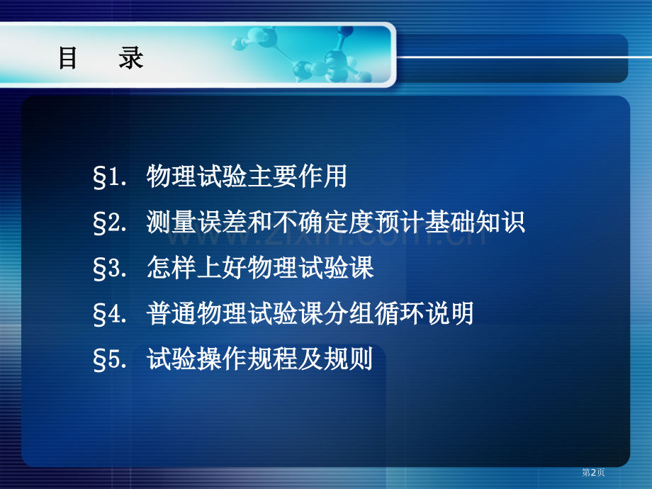 普通物理试验课程绪论普通物理试验课程绪论吉林建筑工程学院第1页目目 录录1.1.物理试验主要作用物理试验主要作用2.2.测量误差和不确定度预计基础知识测量误差和不确定度预计基础知识3.3.怎样上好物理试验课怎样上好物理试验课4.4.普通物理试验课分组循环说明普通物理试验课分组循环说明5.5.试验操作规程及规则试验操作规程及规则第2页1.1.物理试验主要作用物理试验主要作用 物理试验是研究物质运动普通规律及物质基本结构科物理试验是研究物质运动普通规律及物质基本结构科学,它必须以客观事实为基础,必须依靠观察和试验。归学,它必须以客观事实为基础,必须依靠观察和试验。归根结底物理学是一门试验科学,不论物理概念建立还是物根结底物理学是一门试验科学,不论物理概念建立还是物理规律发觉都必须以严格科学试验为基础,并经过今后科理规律发觉都必须以严格科学试验为基础,并经过今后科学试验来证实。学试验来证实。物理试验在物理学发展过程中起着主要和直接作用。物理试验在物理学发展过程中起着主要和直接作用。第3页实验可以发现新事实,结果可认为物理规律建立提供依实验可以发现新事实,结果可认为物理规律建立提供依据据经典物理学(力学、电磁学、光学)规律是经典物理学(力学、电磁学、光学)规律是由以往无数试验事实为依据来总结出来。由以往无数试验事实为依据来总结出来。X X射线、放射性和电子发觉等为原子物理学、射线、放射性和电子发觉等为原子物理学、核物理学等发展奠定了基础核物理学等发展奠定了基础。卢瑟福从大角度卢瑟福从大角度粒子散射试验结果提出了粒子散射试验结果提出了原子核基本模型。原子核基本模型。1.1.物理试验主要作用物理试验主要作用第4页试验又是检验理论正确是否主要判据试验又是检验理论正确是否主要判据理论物理与试验物理相辅相成。规律、公式是否正确必须经受实践理论物理与试验物理相辅相成。规律、公式是否正确必须经受实践检验。只有经受住试验检验,由试验所证实,才会得到公认。检验。只有经受住试验检验,由试验所证实,才会得到公认。电磁场理论提出与公认电磁场理论提出与公认电磁场理论提出与公认电磁场理论提出与公认假说假说库仑定律库仑定律安培定律安培定律高斯定律高斯定律法拉第定律法拉第定律麦克斯韦在麦克斯韦在18651865年提出年提出电磁场理论电磁场理论麦克斯韦方程组麦克斯韦方程组统一了电、磁、光现象统一了电、磁、光现象,预言了电磁波存在并预见预言了电磁波存在并预见到光也是一个电磁波到光也是一个电磁波1879年赫兹试验发觉了年赫兹试验发觉了电磁波存在并证实电磁电磁波存在并证实电磁波传输速度是光速波传输速度是光速电磁场理论电磁场理论才得到公认才得到公认二十多年后二十多年后19爱因斯坦光量子假说总结了光微粒说和波动说之间争论,能很好地解释勒纳德等人光电效应试验结果,不过直到19当密立根以极其严密试验证实了爱因斯坦光电方程之后,光粒子性才为人们所接收。1974年J/粒子发觉更深入证实盖尔曼1964年提出夸克理论。1.1.物理试验主要作用物理试验主要作用第5页物理试验课程目标物理试验课程目标 我们物理试验课程不一样于普通探索性科学试验研究,我们物理试验课程不一样于普通探索性科学试验研究,每个试验题目都经过精心设计、安排,试验结果也比较有每个试验题目都经过精心设计、安排,试验结果也比较有定论,但它是对学生进行基础训练一门主要课。定论,但它是对学生进行基础训练一门主要课。它不但能够加深大家对理论了解,更主要是可使同学它不但能够加深大家对理论了解,更主要是可使同学取得基本试验知识,在试验方法和试验技能诸方面得到较取得基本试验知识,在试验方法和试验技能诸方面得到较为系统、严格训练,是大学里从事科学试验起步,同时在为系统、严格训练,是大学里从事科学试验起步,同时在培养科学工作者良好素质及科学世界观方面,物理试验课培养科学工作者良好素质及科学世界观方面,物理试验课程也起着潜移默化作用。程也起着潜移默化作用。1.1.物理试验主要作用物理试验主要作用第6页2.2.测量误差和数据处理基础知识测量误差和数据处理基础知识2-1 2-1 测量误差和不确定度估算基础知识测量误差和不确定度估算基础知识2-2 2-2 试验数据有效位数确实定试验数据有效位数确实定2-3 2-3 作图法处理试验数据作图法处理试验数据 第7页2-1 测量误差和不确定度估算基础知识2-1 2-1 测量误差和不确定度估算测量误差和不确定度估算物理试验是以测量为基础。物理试验是以测量为基础。测量是指将待测物体某物理测量是指将待测物体某物理量与对应标准作定量比较试验过程量与对应标准作定量比较试验过程。完整测量结果应表示为完整测量结果应表示为:以电阻测量为例以电阻测量为例包含:包含:测量对象测量对象 测量对象量值测量对象量值 测量不确定度测量不确定度 测量值单位测量值单位 (x=U 表示被测对象真值落在(表示被测对象真值落在(U,U)范围内概)范围内概率很大,率很大,U取值与一定概率相联络。)取值与一定概率相联络。)1.1.测测 量量第8页2-1 测量误差和不确定度估算基础知识测量分为测量分