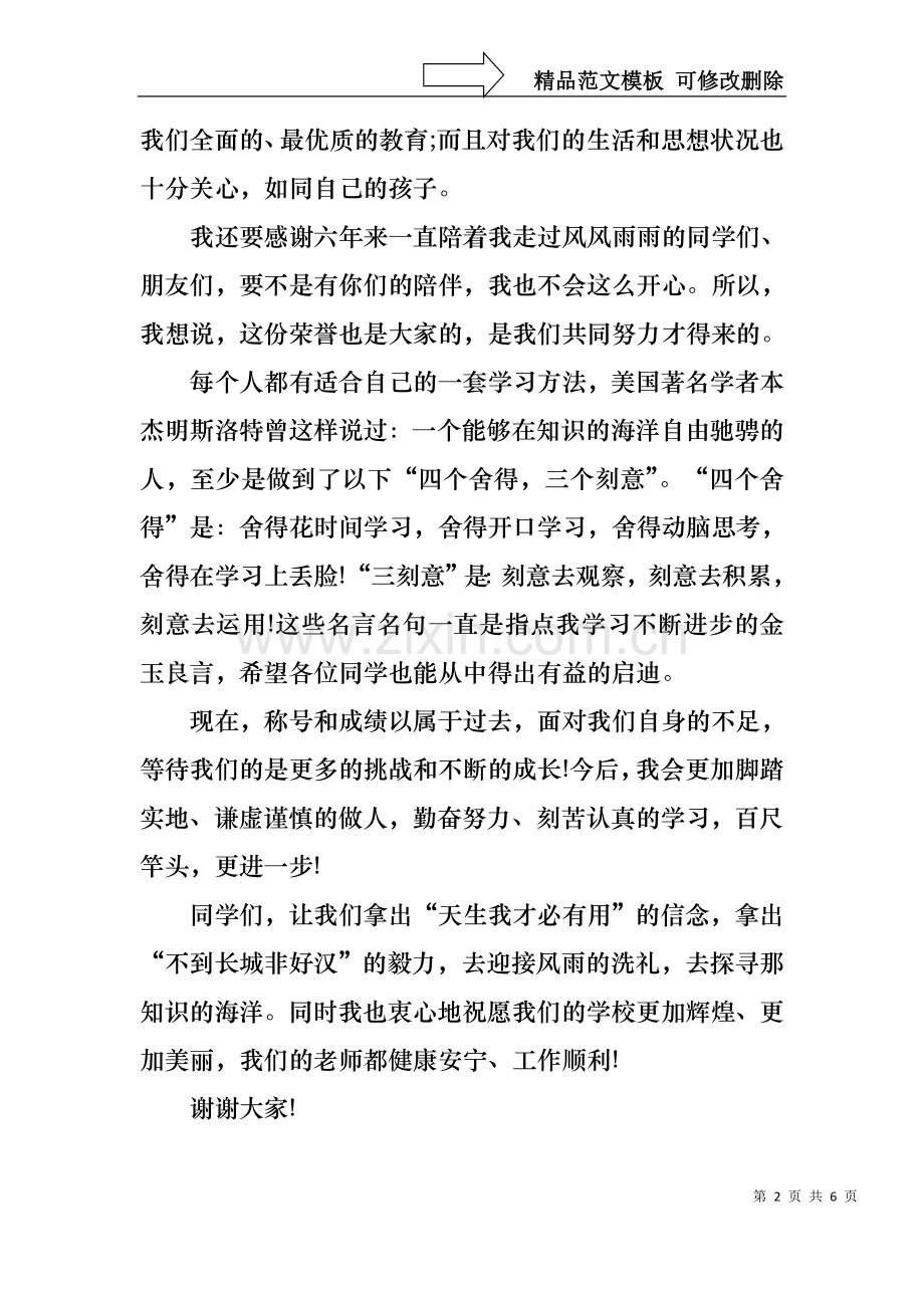对于即将踏出母校大门的我们来说,心中是无比的眷念和留恋,要感谢学校能够用这样一种方式来肯定和嘉奖我们的六年来取得的成绩。其次,我非常感谢我们的老师,他们以伟大的人格魅力塑造了我们的灵魂,他们不仅有良好的教学方法,循循善诱、敬业负责的工作态度,在学习方面给了我们全面的、最优质的教育;而且对我们的生活和思想状况也十分关心,如同自己的孩子。