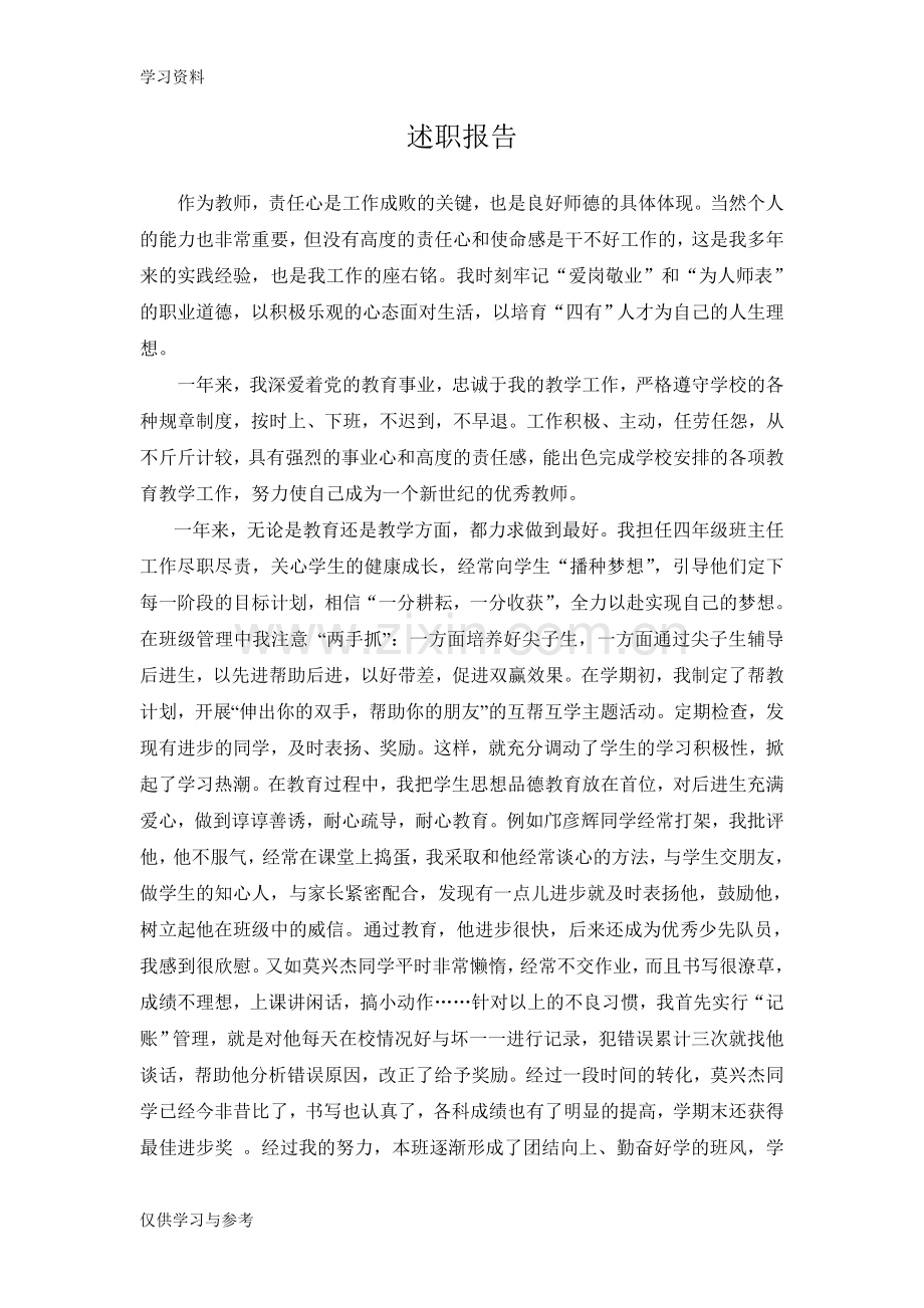 一年来,无论是教育还是教学方面,都力求做到最好。我担任四年级班主任工作尽职尽责,关心学生的健康成长,经常向学生“播种梦想”,引导他们定下每一阶段的目标计划,相信“一分耕耘,一分收获”,全力以赴实现自己的梦想。在班级管理中我注意 “两手抓”:一方面培养好尖子生,一方面通过尖子生辅导后进生,以先进帮助后进,以好带差,促进双赢效果。在学期初,我制定了帮教计划,开展“伸出你的双手,帮助你的朋友”的互帮互学主题活动。定期检查,发现有进步的同学,及时表扬、奖励。这样,就充分调动了学生的学习积极性,掀起了学习热潮。在教育过程中,我把学生思想品德教育放在首位,对后进生充满爱心,做到谆谆善诱,耐心疏导,耐心教育。例如邝彦辉同学经常打架,我批评他,他不服气,经常在课堂上捣蛋,我采取和他经常谈心的方法,与学生交朋友,做学生的知心人,与家长紧密配合,发现有一点儿进步就及时表扬他,鼓励他,树立起他在班级中的威信。通过教育,他进步很快,后来还成为优秀少先队员,我感到很欣慰。又如莫兴杰同学平时非常懒惰,经常不交作业,而且书写很潦草,成绩不理想,上课讲闲话,搞小动作……针对以上的不良习惯,我首先实行“记账”管理,就是对他每天在校情况好与坏一一进行记录,犯错误累计三次就找他谈话,帮助他分析错误原因,改正了给予奖励。经过一段时间的转化,莫兴杰同学已经今非昔比了,书写也认真了,各科成绩也有了明显的提高,学期末还获得最佳进步奖 。经过我的努力,本班逐渐形成了团结向上、勤奋好学的班风,学生的组织纪律性变好了,作业能依时完成,劳动积极肯干,诚实有礼,互助互学,使学生得到了全面的发展。一年来,学生安全事故率为0,差生率为0,曾多次被学校评为先进班级。