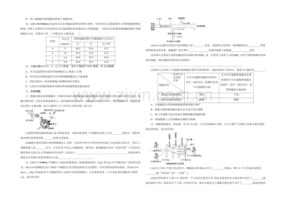 10.(2022·徐州模拟)(多选)雪灵芝是青藏高原特有的野生药材。为争辩雪灵芝提取物对人胃癌细胞增殖的影响,科研人员利用含不同浓度雪灵芝提取物的培育液培育人胃癌细胞,一段时间后检测胃癌细胞周期中各期细胞百分比,结果如下表。下列叙述不正确的是( )