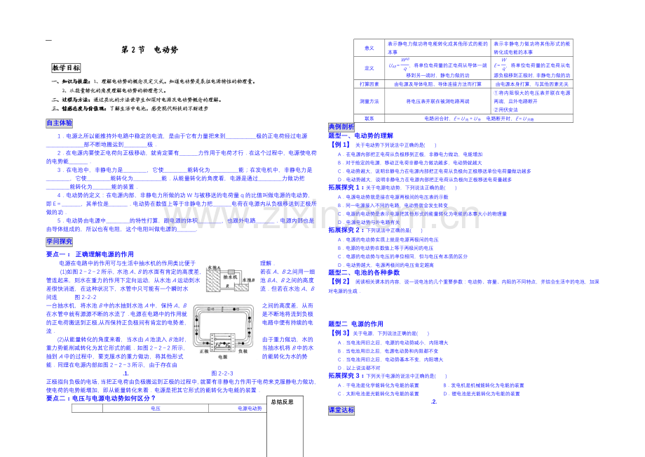(2)从能量转化的角度来看,当水由A池流入B池时,由于重力做功,水的重力势能削减转化为其它形式的能.如图2-2-2所示,当抽水机将B中的水抽到A中的过程中,要克服水的重力做功,将其他形式的能转化为水的势能.同理在电源内部如图2-2-3所示,由于存在由