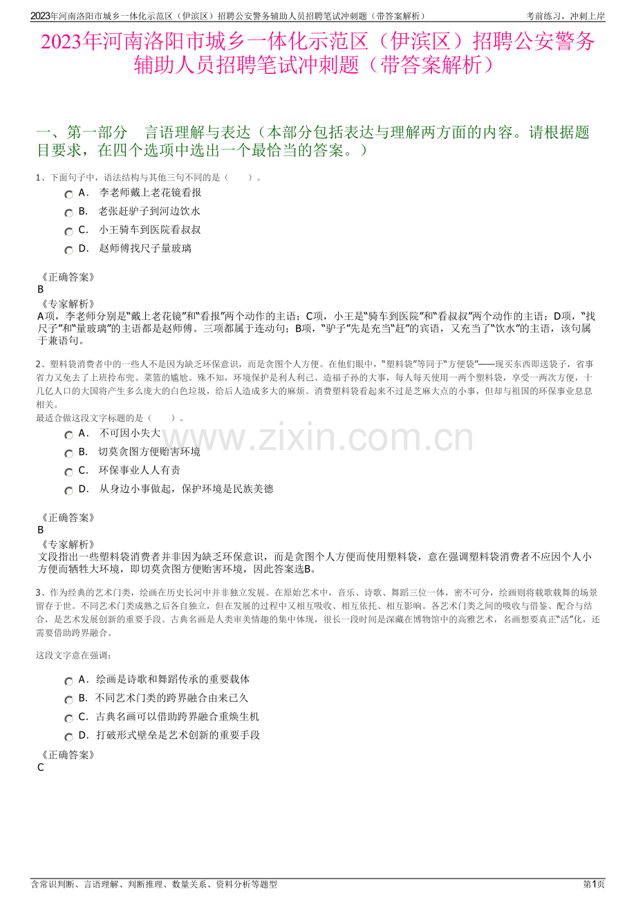 2023年河南洛阳市城乡一体化示范区(伊滨区)招聘公安警务辅助人员招聘笔试冲刺题(带答案解析)一、第一部分言语理解与表达(本部分包括表达与理解两方面的内容。请根据题目要求,在四个选项中选出一个最恰当的答案。)1、下面句子中,语法结构与其他三句不同的是()。A 李老师戴上老花镜看报 B 老张赶驴子到河边饮水 C 小王骑车到医院看叔叔 D 赵师傅找尺子量玻璃正确答案B专家解析A项,李老师分别是“戴上老花镜”和“看报”两个动作的主语;C项,小王是“骑车到医院”和“看叔叔”两个动作的主语;D项,“找尺子”和“量玻璃”的主语都是赵师傅。三项都属于连动句;B项,“驴子”先是充当“赶”的宾语,又充当了“饮水”的主语,该句属于兼语句。2、塑料袋消费者中的一些人不是因为缺乏环保意识,而是贪图个人方便。在他们眼中,“塑料袋”等同于“方便袋”现买东西即送袋子,省事省力又免去了上班拎布兜、菜篮的尴尬。殊不知,环境保护是利人利己、造福子孙的大事,每人每天使用一两个塑料袋,享受一两次方便,十几亿人口的大国将产生多么庞大的白色垃圾,给后人造成多大的麻烦。消费塑料袋看起来不过是芝麻大点的小事,但却与祖国的环保事业息息相关。最适合做这段文字标题的是()。A 不可因小失大 B 切莫贪图方便贻害环境 C 环保事业人人有责 D 从身边小事做起,保护环境是民族美德正确答案B专家解析文段指出一些塑料袋消费者并非因为缺乏环保意识,而是贪图个人方便而使用塑料袋,意在强调塑料袋消费者不应因个人小方便而牺牲大环境,即切莫贪图方便贻害环境,因此答案选B。3、作为经典的艺术门类,绘画在历史长河中并非独立发展。在原始艺术中,音乐、诗歌、舞蹈三位一体,密不可分,绘画则将载歌载舞的场景留存于世。不同艺术门类成熟之后各自独立,但在发展的过程中又相互吸收、相互依托、相互影响。各艺术门类之间的吸收与借鉴、配合与结合,是艺术发展创新的重要手段。古典名画是人类审美情趣的集中体现,很长一段时间是深藏在博物馆中的高雅艺术,名画想要真正“活”化,还需要借助跨界融合。这段文字意在强调:A绘画是诗歌和舞蹈传承的重要载体 B不同艺术门类的跨界融合由来已久 C古典名画可以借助跨界融合重焕生机 D打破形式壁垒是艺术创新的重要手段正确答案C2023年河南洛阳市城乡一体化示范区(伊滨区)招聘公安警务辅助人员招聘笔试冲刺题(带答案解析)考前练习,冲刺上岸含常识判断、言语理解、判断推理、数量关系、资料分析等题型第1页专家解析文段开篇引出绘画发展的话题,随后指出绘画可留存载歌载舞的场景。紧接着通过转折关联词“但”强调不同艺术门类在成熟后的发展过程中是相互借鉴的,并表明此种方式对艺术发展创新很重要。接下来指出古典名画是一种高雅艺术,尾句通过“需要”引出对策,强调古典名画需要借助跨界融合来实现“活”化。故文段为分总结构,强调古典名画需要跨界融合,核心话题为“古典名画”“跨界融合”,对应C项。A项,对应文段转折之前的内容,非重点,且偏离文段核心话题“古典名画”“跨界融合”,排除;B、D两项,均偏离文段核心话题“古典名画”,排除。故正确答案为C。【文段出处】人民网名画“活”了 传统文化“火”了4、用一夜读完的小说有一种是靠情节取胜,像达芬奇密码。还有一种就是像朗读者,很难说它靠什么来吸引人需要用一夜读完,没有_的情节设置,也没有_的人物关系。填入划横线部分最恰当的一项是()。A 环环相扣千头万绪 B 引人入胜纷繁芜杂 C 抑扬顿挫扑朔迷离 D 跌宕起伏错综复杂正确答案D专家解析A项错误,“千头万绪”比喻事情的头绪非常多,也形容事情复杂纷乱,一般不与“人物关系”搭配。B项错误,“纷繁芜杂”是指多而杂乱,没有条理,与句意不符。C项错误,“抑扬顿挫”形容声音高低起伏,节奏分明,和谐悦耳。一般指音乐、朗诵,有时也指文学作品,不能用来形容小说情节。D项正确,“跌宕起伏”形容事物多变,不稳定,与“情节设置”搭配恰当;“错综复杂”形容头绪繁多,相互纠结,情况复杂,与“人物关系”搭配合适。“跌宕起伏”的情节设置和“错综复杂”的人物关系往往是吸引读者一夜读完的重要因素,与句意相符。5、只有场外交易或政府出面干预,公家单位才有可能拿到藏品,否则拍卖场上的许多好书,图书馆都难以得到。这种情况在图书馆界普遍存在。是公家经费缺乏吗?至少不全是。通常的原因在于:有些管理者或对古籍价值的认识片面,或畏惧市场,怕承担责任;体制上的限制也使得预算难以跟上拍卖市场的变化;再就是缺少真正懂行的专家,有钱也未必能识书、买到好书。目前社会上,流通领域与收藏界的行家手里比图书馆多,他们的水平是在市场竞争中打拼出来的,有的本来就是学问家。这段文字重在()。A 分析图书馆难以拿到藏品的原因 B 说明政府在图书管理方面责任的缺失 C 强调图书馆难以拿到藏品的现象普遍存在 D 提醒我们图书馆界存在严重问题正确答案A专家解析文中首先提出图书馆难以拿到藏品的问题,接着用“通常的原因在于”进行解释说明,因此文段是以“图书馆难以拿到藏品的原因”作为中心,即主要是为了说明图书馆难以拿到藏品的原因。6、下列各句中,语意明确的一句是()。A 他背着总经理和