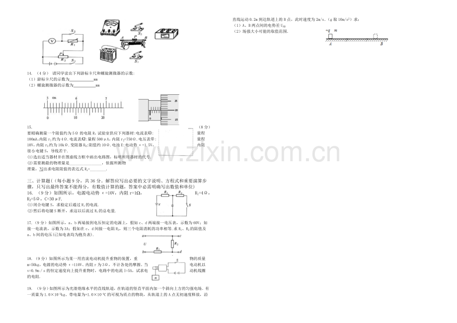 18. (9分)如图所示为某一用直流电动机提升重物的装置,重物的质量m=50kg,电源的电动势ε=110V、内阻r为3Ω,不计各处的摩擦。当电动机以v=0.9m/s的恒定速度向上提升重物时,电路中的电流I=5A,试求电动机线圈的电阻.