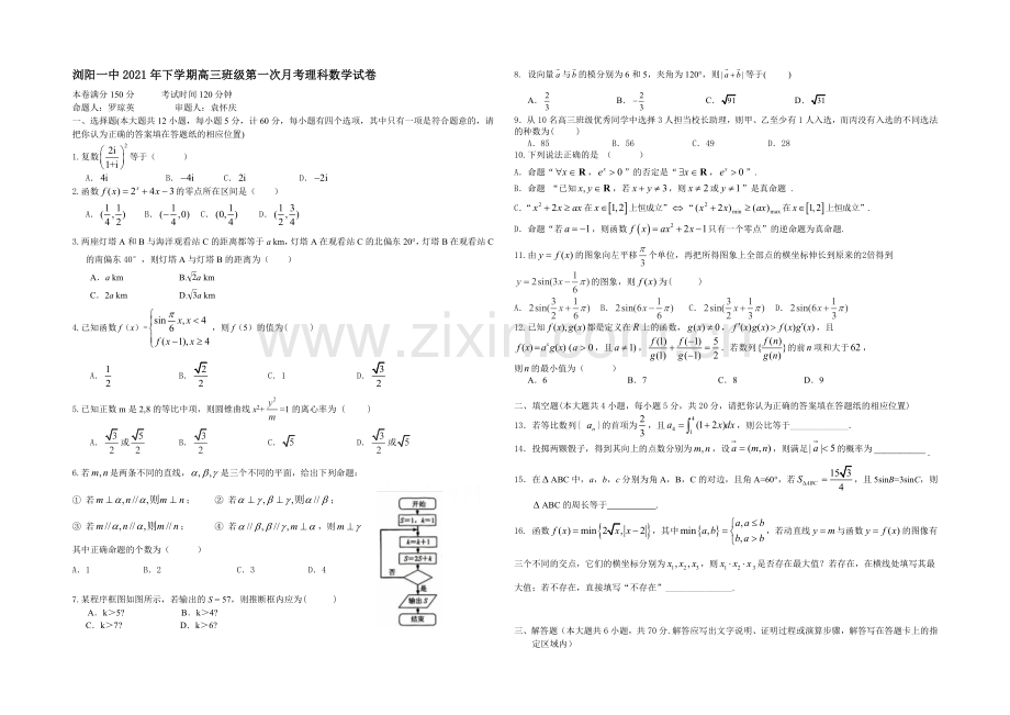 浏阳一中2021年下学期高三班级第一次月考理科数学试卷