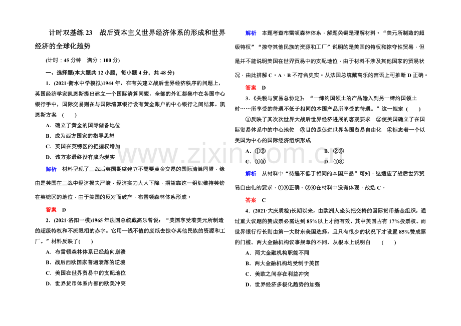 计时双基练23 战后资本主义世界经济体系的形成和世界经济的全球化趋势