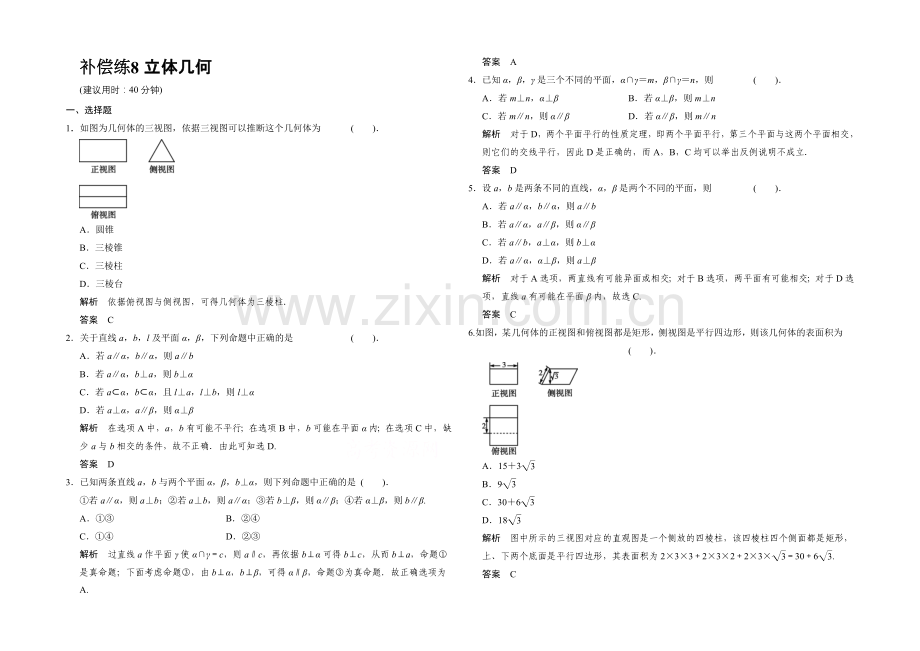 1.如图为几何体的三视图,依据三视图可以推断这个几何体为 ( ).