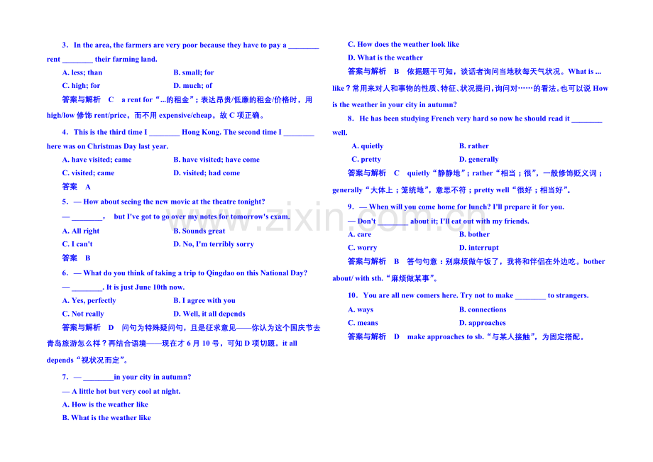 答案与解析 D 问句为特殊疑问句,且是征求意见——你认为这个国庆节去青岛旅游怎么样?再结合语境——现在才6月10号,可知D项切题。it all depends“视状况而定”。
