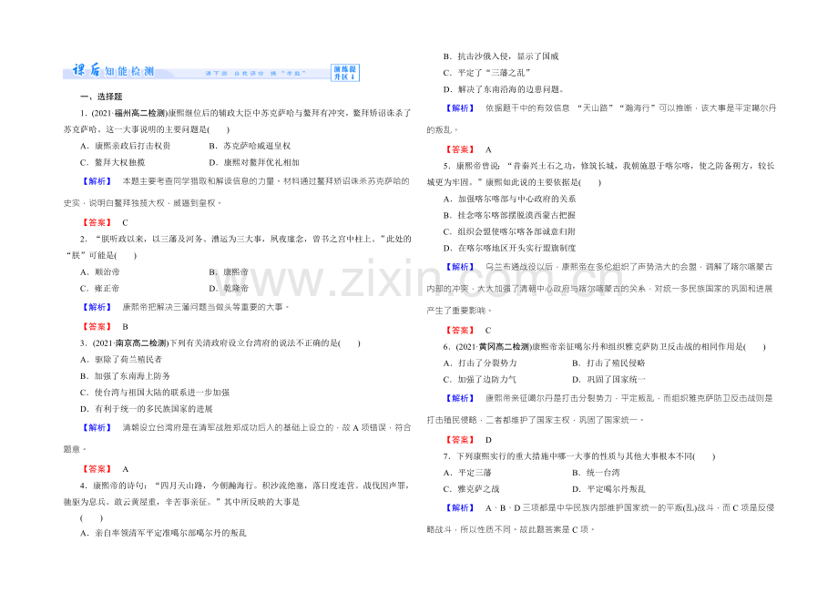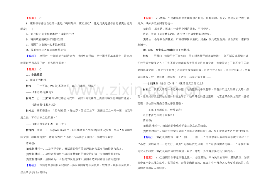 【解析】 本题考查康熙巩固我国统一多民族国家的相关史实,较简洁,联系相关史实,结合所学学问回答即可。