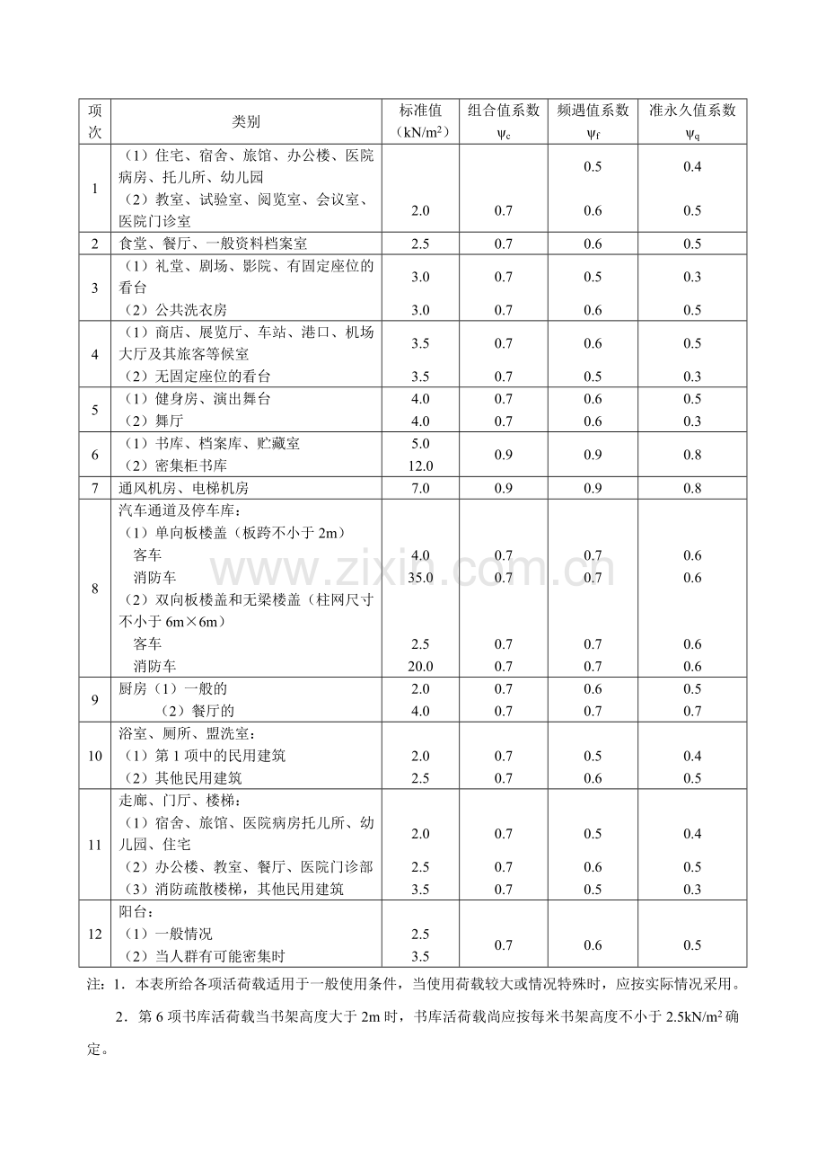 3.民用建筑楼面均布活荷载标准值及其组合值、频遇值和准永久值系数(见表2-1)