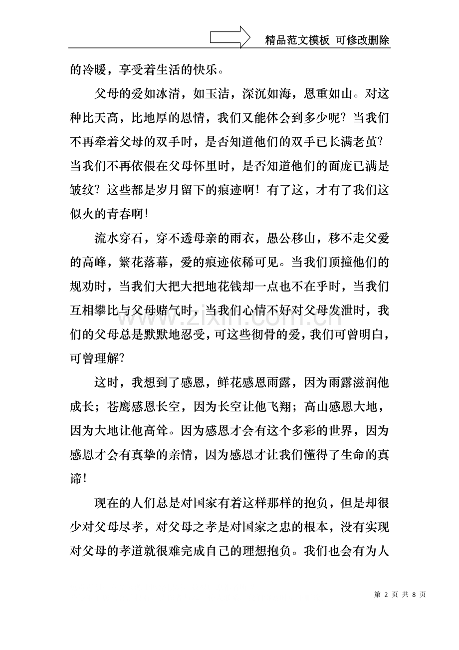 父母待我如同太阳呵护小草一样,我这棵小草难道不应该越长越茂盛,报答父母对我的关爱和呵护吗?所以,假如父母是天,那我便是天空中飞翔的小鸟,我要驱赶乌云,让天空永远蔚蓝。假如父母是大地,我就是那棵小草,我要越长越茂盛,为大地增添一片绿色。假如父母是大山,我就是一棵小树,我要结出丰硕的果实,为大山增添光彩。假如父母是大海,我就是大海中的一条小鱼,我要尽情地畅游,让大海充满生机。