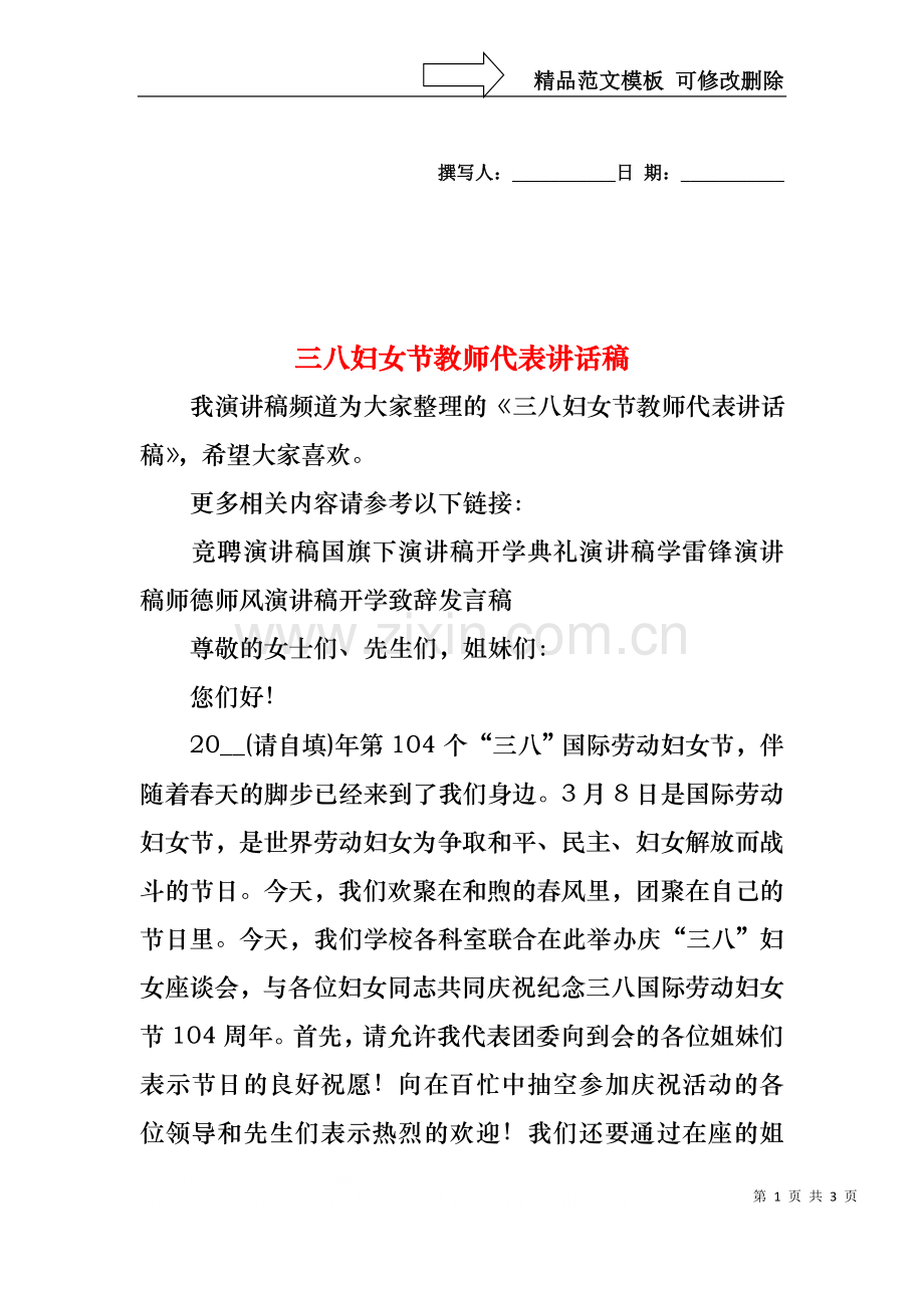 <p>三八妇女节教师代表讲话稿.docx</p>