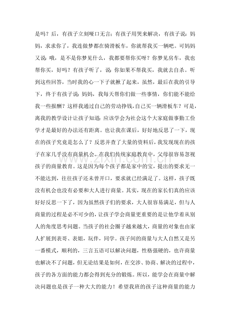 因此我在课堂上首先设计了相关的场景:由于没有学会与别人商量,不会用商量的口吻与别人交换意见,而造成了别人的误解,从而体会学会商量的重要。接着,我让学生对三幅图的场景进行模拟练习,体会商量的实际作用,孩子们的商量的场面可谓是彬彬有礼,态度和谦,很热闹。经过前面的准备以后,我对班上孩子的商量的水平很有信心。于是,最后,我以图中人物的老师、妈妈等身份与班上部分孩子进行交流,其实也是对孩子商量能力的一种检查。可出乎我的意料之外的是,检查结果让我大吃一惊,很多孩子在设计的场景中,知道遇到事情要与人商量,但他们商量时说的话却是很幼稚的。有孩子说:妈妈,你帮我买一辆滑板车吧,我一定好好学习。在听到妈妈的回答你学习是为我学的吗?我不帮你买滑板车,你就不好好学习了,是吗?后,有孩子立刻哑口无言;有孩子用哭来解决,有孩子说:妈妈,求求你了,我连做梦都在骑滑板车,你就帮我买一辆吧。可妈妈又说:哦,是不是你梦见什么,我都要帮你买呀?你梦见房车,我也帮你买,好吗?有孩子听了,说:你如果不帮我买,我就去自杀。听到这些回答,当时我的心一下子就揪了起来,虽然,最后在我的引导下,终于有孩子说:妈妈,我每天帮你们做一些事情,你们能不能给我一些报酬?这样我通过自己的劳动挣钱,自己买一辆滑板车?可是,离我的教学设计让孩子知道:应该学会为社会这个大家庭做事勤工俭学才是最好的办法还有距离。也让我在课后,好好地反思了一下,现在的孩子究竟是怎么了?反思并查了大量的资料后,我发现现在的孩子在家几乎没有商量机会。在我们传统家庭教育中,父母很容易忽视孩子的商量教育。这是因为每个孩子都是家中的宝,提出的要求无一不能达到,往往孩子还未曾开口,要求就已经满足了。这样,孩子既没有机会也没有必要和大人进行商量。其实,现在的家长们真的应该好好反思一下了,因为虽然孩子们的要求,大人很容易满足,但与人商量的过程是必不可少的,让孩子学会商量更重要的是让他学着从别人的角度思考问题。当孩子的社会圈子越来越大,商量的对象也由家人扩展到表哥、表姐,玩伴,同学。孩子间的商量与大人自然又是另一番模式,顺利的,三言五语可以解决问题,性格强硬的,也许商量也解决不了问题,但无论结果是如何,在交涉、协商、解决的过程中,孩子的各方面的能力都会得到充分的锻炼。所以,能学会在商量中解决问题也是孩子一种大大的能力!希望我班的孩子这种商量的能力在短时间内有大的提高。