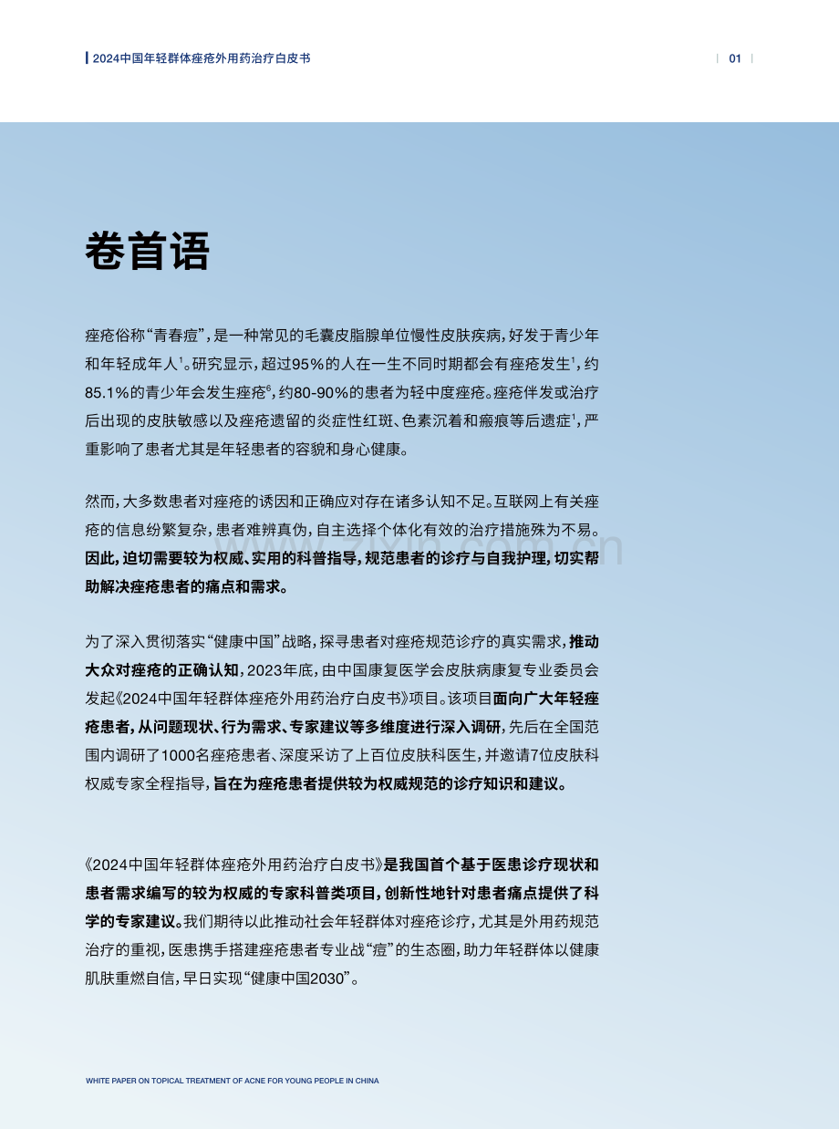 痤疮俗称“青春痘”,是一种常见的毛囊皮脂腺单位慢性皮肤疾病,好发于青少年和年轻成年人1。研究显示,超过95%的人在一生不同时期都会有痤疮发生1,约85.1%的青少年会发生痤疮6,约80-90%的患者为轻中度痤疮。痤疮伴发或治疗后出现的皮肤敏感以及痤疮遗留的炎症性红斑、色素沉着和瘢痕等后遗症1,严重影响了患者尤其是年轻患者的容貌和身心健康。然而,大多数患者对痤疮的诱因和正确应对存在诸多认知不足。互联网上有关痤疮的信息纷繁复杂,患者难辨真伪,自主选择个体化有效的治疗措施殊为不易。因此,迫切需要较为权威、实用的科普指导,规范患者的诊疗与自我护理,切实帮助解决痤疮患者的痛点和需求。为了深入贯彻落实“健康中国”战略,探寻患者对痤疮规范诊疗的真实需求,推动大众对痤疮的正确认知,2023年底,由中国康复医学会皮肤病康复专业委员会发起 2024中国年轻群体痤疮外用药治疗白皮书 项目。该项目面向广大年轻痤疮患者,从问题现状、行为需求、专家建议等多维度进行深入调研,先后在全国范围内调研了1000名痤疮患者、深度采访了上百位皮肤科医生,并邀请7位皮肤科权威专家全程指导,旨在为痤疮患者提供较为权威规范的诊疗知识和建议。2024中国年轻群体痤疮外用药治疗白皮书 是我国首个基于医患诊疗现状和患者需求编写的较为权威的专家科普类项目,创新性地针对患者痛点提供了科学的专家建议。我们期待以此推动社会年轻群体对痤疮诊疗,尤其是外用药规范治疗的重视,医患携手搭建痤疮患者专业战“痘”的生态圈,助力年轻群体以健康肌肤重燃自信,早日实现“健康中国2030”。卷首语2024中国年轻群体痤疮外用药治疗白皮书01WHITE PAPER ON TOPICAL TREATMENT OF ACNE FOR YOUNG PEOPLE IN CHINA牵头专家专家组成员王秀丽上海市皮肤病医院鞠强上海交通大学医学院 附属仁济医院徐子刚首都医科大学 附属北京儿童医院陶娟华中科技大学同济 医学院附属协和医院许阳江苏省人民医院潘展砚上海交通大学医学院 附属仁济医院张玲琳上海市皮肤病医院发起和指导单位中国康复医学会皮肤病康复专业委员会指导专家赫力昂(中国)有限公司支持单位上海麦色信息科技有限公司(优麦医生)益普索(中国)咨询有限公司执行单位2024中国年轻群体痤疮外用药治疗白皮书02WHITE PAPER ON TOPICAL TREATMENT OF ACNE FOR YOUNG PEOPLE IN CHINA洞察来源样本规模主要输出患者调查医生调查主要研究方法说明调查方法:在线定量问卷调查500个一般人群样本+500个过去1年有治疗痤疮经历的患者样本一般人群定义:18-29 岁本人,混合男女,混合学生&工作人群,及16-17岁青少年的母亲回收135个皮肤科临床医生样本调查医生条件:主任/副主任/主治医生,90%以上接受访问医生每周出2个或以上半天的门诊,平均每周接诊痤疮患者人数为39人调查时间:2023年12月2024年1月调查范围:覆盖20个一线和二线城市痤疮患病率痤疮患者治疗方案、治疗观念皮肤科临床医生对痤疮的治疗方案、治疗理念等洞察调查方法:在线定量问卷调查;并在定量调查前,举行医生定性深访,了解医生接诊痤疮患者的基本情况、治疗方案,和对常见治疗方案的看法等调查时间:2024年2月调查范围:覆盖全国12个省的三级或二级综合医院和儿童医院一般人群(N=500)过去 1 年有治疗痤疮经历(一般人群中自然落出另追加样本,N=500)过去 1 年患痤疮综合医院皮肤科医生(接诊成人+青少年痤疮患者)(N=126)儿童医院皮肤科医生(接诊青少年痤疮患者)(N=9)2024中国年轻群体痤疮外用药治疗白皮书03WHITE PAPER ON TOPICAL TREATMENT OF ACNE FOR YOUNG PEOPLE IN CHINA科学选择正确使用外用药治疗的常见问题和解决之道4直面痤疮年轻人群痤疮患病率和患者概览1痤疮外用药治疗进行时年轻人群痤疮对外用药的实际使用情况医生在治疗痤疮中对外用药和其他用药的治疗建议3规范治疗专业战“痘”痤疮外用药规范治疗的专业建议5痤疮患者现状面面观年轻人群痤疮认知现状,需求现状,信息渠道现状,行为现状2目录Table of contents05113124412024中国年轻群体痤疮外用药治疗白皮书WHITE PAPER ON TOPICAL TREATMENT OF ACNE FOR YOUNG PEOPLE IN CHINA中国年轻群体痤疮患病率高,且严重影响身心健康。九成患者为轻度或中度痤疮。专家建议轻中度患者应及早采取规范管理手段,缩短治疗周期,同时努力减少诱发因素,阻止症状反复和加重,防止产生永久性痤疮瘢痕。直面痤疮年轻人群痤疮患病率和患者概览12024中国年轻群体痤疮外用药治疗白皮书05WHITE PAPER ON TOPICAL TREATMENT OF ACNE FOR YOUNG PEOPLE IN CHINA患者问卷:请问,过去12个月(2023年1月2023年12月),【您/您孩子】是否存在以下皮肤问题?(复选)中国年轻群体中痤疮患病率高,尤其是青少年、女性群体。根据调查,在中国一二线城市16-29岁年轻群体中,过去1年的痤疮患病率约为36%。在16-29岁年轻群体中,女性痤疮患病率略高于男性。在中国一二线城市16-29岁普通人群中自述过去1年有粉刺/痘痘/痤疮36%基数:一般人群(N=500)男性患病率(N=250)16-17岁患病率(N=127)女性患病率(N=250)18-29岁患病率(N=373)32%46%40%35%2024中国年轻群体痤疮外用药治疗白皮书06WHITE PAPER ON TOPICAL TREATMENT OF ACNE FOR YOUNG PEOPLE IN CHINA痤疮对年轻群体造成广泛身心困扰:行为受限、影响社交、心理自卑。痤疮患者中,71%导致饮食忌口,56%产生自卑或不自信等心理影响,53%的患者影响社交。痤疮患