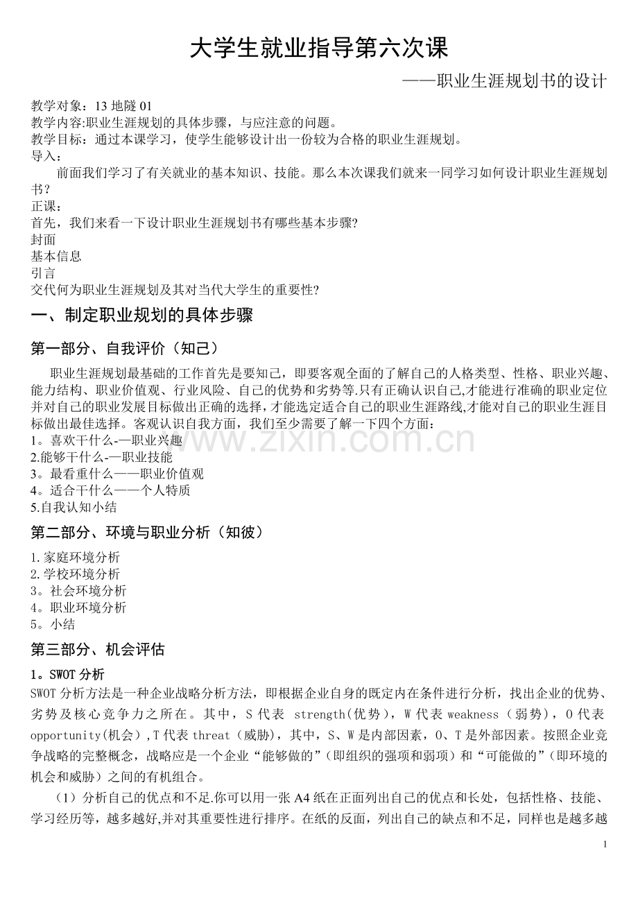 教学内容:职业生涯规划的具体步骤,与应注意的问题。