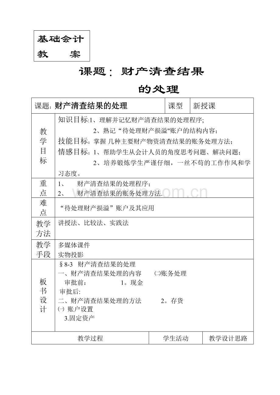知识目标:1、理解并记忆财产清查结果的处理程序;