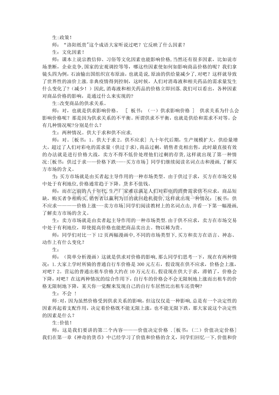 师:同学们,大家好!现在开始上课。在前面的学习中,我们揭开了货币神秘的面纱,同时了解了信用工具和外汇,系统地完成了《神奇的货币》这一课的学习。通过学习,我们知道货币真的挺神奇的,有人就说,钱是好东西啊,它可以上买天下买地中间还能买空气。显然这种说法不科学,但它至少说明了一个事实,那就是钱可以买东西.那么买东西光有钱就行吗?还得知道价格。在日常生活中,我们经常去市场或超市中购买一些生活用品或文具等,那大家注意到没有,所有商品的价格都是固定不变的么?