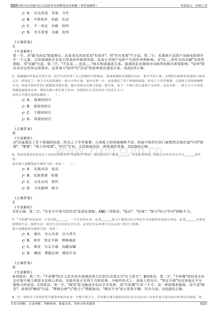 2023年四川达州通川区人民陪审员招聘笔试冲刺题(带答案解析)一、第一部分言语理解与表达(本部分包括表达与理解两方面的内容。请根据题目要求,在四个选项中选出一个最恰当的答案。)1、_是有同情心的富人也缺乏相关的信息,他们完全可以帮助的一些人_就在离他们100米之外的需要一件衬衫,但是人们却不得不把自己生产的衬衫以几美元的价格卖给沃尔玛让它赚几千美元而自己却_赚取几元人民币。最后让一个美国人穿一次就扔了它,也_缺乏信息不能把这件衬衫送给那个真正需要穿几十次的他的同胞。这一段中应填入的最恰当的一组词语是()。A 虽然原来宁愿由于 B 尽管或许只好因为 C 虽然也许只能由于 D 即使也许只能因为正确答案D专家解析第一空,由“是有同情心的富人也缺乏相关的信息”可知,假设“是有同情心的富人”也会出现“缺乏相关的信息”的情况,所填词应表示让步假设关系,应选“即使也”。因此D项正确。2、我们说儒家是道德至上或者道德决定论的时候,是一种宏观上的总体定性和评价。所谓“子罕言利”或者“小人喻于利”,是着眼于人作为一种道德存在、超越存在的“应然”特质而立论,所拒斥和鄙夷的只是“不义而富且贵”。具体到关乎民生的问题,儒家并非不言利、否定利,而是主张让利于民,惠民富民;并非认为道德决定民生,而是认为民生决定道德。根据这段文字,以下说法正确的是()。A 儒家认为“利”在不同历史时期有不同的含义 B 儒家的民生观不是空谈道德而是强调以民为本 C 儒家认为道德与民生并不对立,而是相互促进 D 在民生问题上,儒家倡导道德至上正确答案B专家解析题中首先提出儒家排斥“不义而富且贵”;接着指出关于民生,儒家主张让利于民,惠民富民,认为民生决定道德。A项错误,“不同时期”在文中没有涉及。C项错误,“相互促进”与文中“并非认为道德决定民生而是”相矛盾。D项错误,儒家道德至上与文中不符。B项正确,儒家的民生观是强调以民为本。3、在大型游乐园里,现场表演是刻意用来引导人群流动的。午餐时间的表演是为了减轻公园餐厅的压力;傍晚时间的表演则有一个完全不同的目的,鼓励参观者留下来吃晚餐。表面上不同时间的表演有不同的目的,但这背后,却有一个统一的潜在目标。这个统一的潜在目标是()。A 尽可能地减少各旅游点的排队人数 B 吸引更多的人来看现场表演,以增加利润 C 尽可能地招揽顾客,希望他们再来公同游览 D 在尽可能多的时间里最大限度地发挥餐厅的作用正确答案D专家解析两个项目的经营目的,既不独立也不是均等的,第一个项目为第二个项目服务,即现场表演的目的是通过对人流的引导,在尽可能多的时间里最大限度地发挥餐馆的市场,因此D项正确。4、传统绘画风格对中国动画电影的影响_,其中意义最为深远的就是水墨画对国产动画电影所作的_,这不仅是中国民族风格的体现,也是世界动画界的一次_。依次填入划横线部分最恰当的一项是()。2023年四川达州通川区人民陪审员招聘笔试冲刺题(带答案解析)考前练习,冲刺上岸含常识判断、言语理解、判断推理、数量关系、资料分析等题型第1页 A 比比皆是革新合作 B 不胜枚举突破尝试 C 不一而足贡献创举 D 至关重要贡献创举正确答案C专家解析第一空,由“最为深远”就能推出,此处表达的意思是“有很多”,用“至关重要”不合适。第二空,水墨画只是国产动画电影制作中一个元素,文段强调的并非是它带来的革新和突破,而是它对国产电影产生的作用和影响,且“对所作出的贡献”为常用搭配,用“贡献”合适。第三空,“不仅是也是”前后构成递进关系,强调的是水墨画对动画界的极为重要影响,“创举”指从未有过的举动或事业,这里填入“创举”比“尝试”更能体现出递进关系。因此C项正确。5、我磕磕绊绊地走在村庄里,似乎仅仅听到了自己的脚步声和喘息。两堵泥墙的夹缝偶尔闪出一条窄窄的小巷,光滑的石板路笔直地伸入纵深之后一折绕走了。巷子尽头的泥墙有一扇小小的石窗,窗内乌黑一片。沿途遇见了若干倒塌的院落,阳光之下芳草萋萋,几堵孤立的残墙缄默不语,两扇开始朽烂的门板黯然歪倒在地。随行的朋友从路上捡起一根竹条,说下一个路口的几条狗十分凶悍。话音未落,一群大大小小的黄狗雄赳赳地冲出来,拥挤在路口伸长脖子狂吠,仿佛他们才是这些房子的真正主人。这段文字最合适的标题是()。A 孤独的村庄 B 原始的村庄 C 宁静的村庄 D 落寞的村庄正确答案D专家解析由“沿途遇见了若干倒塌的院落,阳光之下芳草萋萋,几堵孤立的残墙缄默不语,两扇开始朽烂的门板黯然歪倒在地”中的“倒塌”、“萋萋”、“孤立的残墙”、“朽烂”可知,文段描述的是一种落寞的景象。因此D项正确。6、母语的基本性质决定了母语高等教育的“培根固本”特征,母语教育对于维系_,传承优秀传统,构筑心灵世界具有不可_的作用。依次填入划横线部分最恰当的一项是()。A 民族风俗低估 B 民族情感轻视 C 文化认同替代 D 文化精神缺少正确答案C专家解析C项正确,第二空,“具有不可替代的作用”是固定搭配。ABD三项错误,“低估”、“轻视”、“缺少”均与“作用”搭配不当。7、“不折腾”其实是对一个常识的_:一个正常的社会,必须_致力于增进以民主和民生为双轴的全民核心利益,必须_改