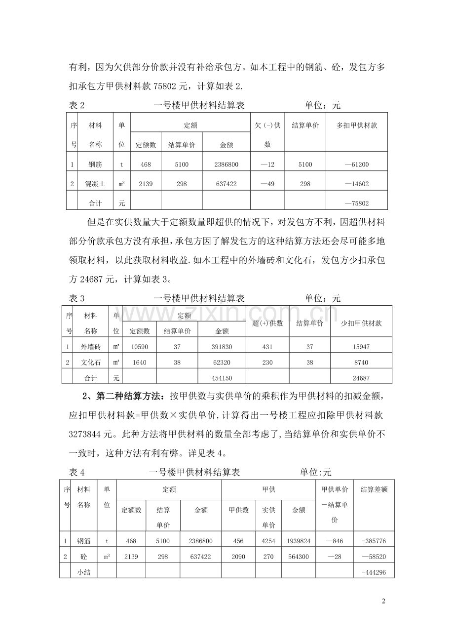 该结算方法计算简单,在实供数量小于定额数量即欠供的情况下,对发包方有利,因为欠供部分价款并没有补给承包方。如本工程中的钢筋、砼,发包方多扣承包方甲供材料款75802元,计算如表2.