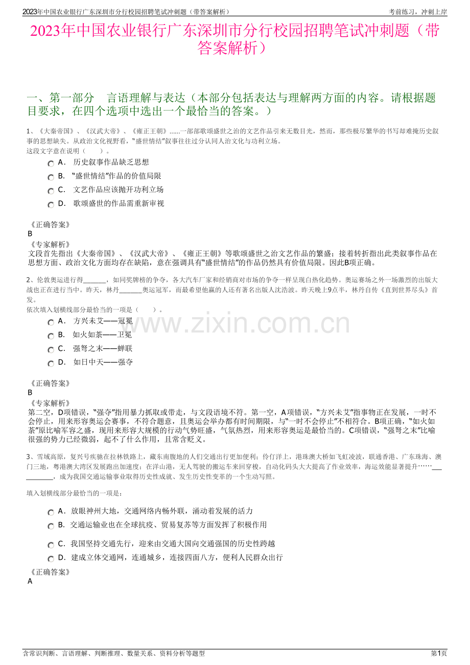 2023年中国农业银行广东深圳市分行校园招聘笔试冲刺题(带答案解析)一、第一部分言语理解与表达(本部分包括表达与理解两方面的内容。请根据题目要求,在四个选项中选出一个最恰当的答案。)1、大秦帝国、汉武大帝、雍正王朝一部部歌颂盛世之治的文艺作品引来无数目光,然而,那些极尽繁华的书写却难掩历史叙事的思想缺失。从政治文化视野看,“盛世情结”叙事往往过分认同人治文化与功利立场。这段文字意在说明()。A 历史叙事作品缺乏思想 B“盛世情结”作品的价值局限 C 文艺作品应该抛开功利立场 D 歌颂盛世的作品需重新审视正确答案B专家解析文段首先指出大秦帝国、汉武大帝、雍正王朝等歌颂盛世之治文艺作品的繁盛;接着转折指出此类叙事作品在思想方面、政治文化方面均存在缺陷,意在强调具有“盛世情结”的作品仍然具有价值局限。因此B项正确。2、伦敦奥运进行得_,如同奖牌榜的争夺,各大汽车厂家和经销商对市场的争夺一样呈现白热化趋势。奥运赛场之外一场激烈的出版大战也正在进行当中。昨天,林丹_奥运冠军,而最希望他赢的人还有著名出版人沈浩波。昨天晚上9点半,林丹自传直到世界尽头首发。依次填入划横线部分最恰当的一项是()。A 方兴未艾冠冕 B 如火如荼卫冕 C 强弩之末蝉联 D 如日中天强夺正确答案B专家解析第二空,D项错误,“强夺”指用暴力抓取或带走,与文段语境不符。第一空,A项错误,“方兴未艾”指事物正在发展,一时不会停止,用来形容奥运会赛事,不符合题意,且奥运会举办都有时间期限,与“一时不会停止”不相符合。B项正确,“如火如荼”原比喻军容之盛,现用来形容大规模的行动气势旺盛,气氛热烈,用来形容奥运是最恰当的。C项错误,“强弩之末”比喻很强的势力已经微弱,起不了什么作用,且常含贬义。3、雪域高原,复兴号疾驰在拉林铁路上,藏东南腹地的人们交通出行更加便利;伶仃洋上,港珠澳大桥如飞虹凌波,联通香港、广东珠海、澳门三地,粤港澳大湾区发展跑出加速度;在洋山港,无人驾驶的搬运车来回穿梭,自动化码头大大提高了作业效率,海运效能显著提升 ,成为我国交通运输事业取得历史性成就、发生历史性变革的一个生动写照。填入划横线部分最恰当的一项是:A放眼神州大地,交通网络内畅外联,涌动着发展的活力 B交通运输业也在全球抗疫、贸易复苏等方面发挥了积极作用 C我国坚持交通先行,迎来由交通大国向交通强国的历史性跨越 D建成立体交通网,连通城乡,连接四面八方,便利人民群众出行正确答案A2023年中国农业银行广东深圳市分行校园招聘笔试冲刺题(带答案解析)考前练习,冲刺上岸含常识判断、言语理解、判断推理、数量关系、资料分析等题型第1页专家解析横线出现在文段中间,需结合上下文内容进行分析。文段开篇通过并列分句列举了雪域高原、伶仃洋、洋山港的例子,其中雪域高原的例子强调交通的畅达使得人们出行更加便利,伶仃洋和洋山港的例子则强调交通的发展,联通了大陆与域外,且“跑出加速度”“提高了作业效率,海运效能显著提升”进一步突出了交通对于各项发展的带动作用,横线后论述这些案例成为我国交通运输事业取得历史性成就、发生历史性变革的生动写照,故横线处所填语句,重在对上文进行概括,强调我国交通事业的发展,不仅使得国内与国外畅通联动,更为发展提供了助力,对应A项。B项,文段并未提及“全球抗疫”“贸易复苏”,无中生有,排除;C项,文段中并未提及“交通先行”,无中生有,且未能突出我国交通的便利以及对发展的积极影响,偏离前文中心,排除;D项,“便利人民群众出行”仅能对应文段中“雪域高原”这一部分内容,表述片面,排除。故正确答案为A。【文段出处】人民日报建设交通强国,发挥现代化开路先锋作用强国之路正扬帆4、兰科植物全球现有接近30000个物种,我国约有1600余种。它们与中国社会有着深远而 的联系。公元元年以前的神农本草经,已有关于石斛、天麻等兰科植物的药用记录;而将兰科植物用于观赏的 ,可能始于三国时期的贵族阶层,并 到了当代。依次填入画横线部分最恰当的一项是:A确切 习俗 影响 B密切 传统 延续 C广泛 情形 波及 D紧密 做法 沿袭正确答案B专家解析第一空,搭配“联系”,B项“密切”指关系近,C项“广泛”指(涉及的)范围广、面积大、普遍,D项“紧密”指密不可分,均与“联系”搭配得当,保留。A项“确切”指准确、恰当,可以说确切的消息,与“联系”搭配不当,排除。第二空,根据横线后“可能始于三国时期的贵族阶层,并到了当代”可知,横线处应与之形成对应,体现出“从古到今都有”之意,B项“传统”指世代相传具有特点的社会因素,如文化、思想、制度等,符合文意,保留。C项“情形”指事物呈现出来的样子,D项“做法”指制造东西或处理事情的方法,均与文意不符,排除。第三空,代入验证,搭配“当代”,结合前文“始于三国时期的贵族阶层”可知,横线处应体现“流传至今”之意。B项“延续”指延长或继续下去,符合文意,当选。故正确答案为B。【文段出处】澎湃新闻澎湃号湃客天价交易下历尽劫难的野生兰花,终于有了“护身符”5、中国古代货币,是世界上起源最早的货币之一。它_,对古代世界上国际经济交往,特别是亚洲各国货币的发展有着相当_的影响。依次填入划横线部分