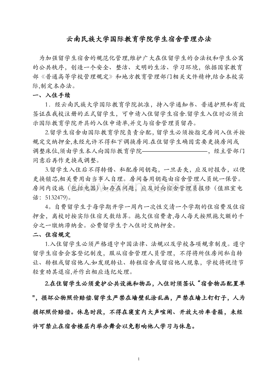 1.经云南民族大学国际教育学院批准,持入学通知书、普通护照和有效签证在我校注册的正式留学生,可申请入住留学生宿舍.留学生入住时必须出示国际教育学院开具的入住申请单,并交与宿舍管理员留存。