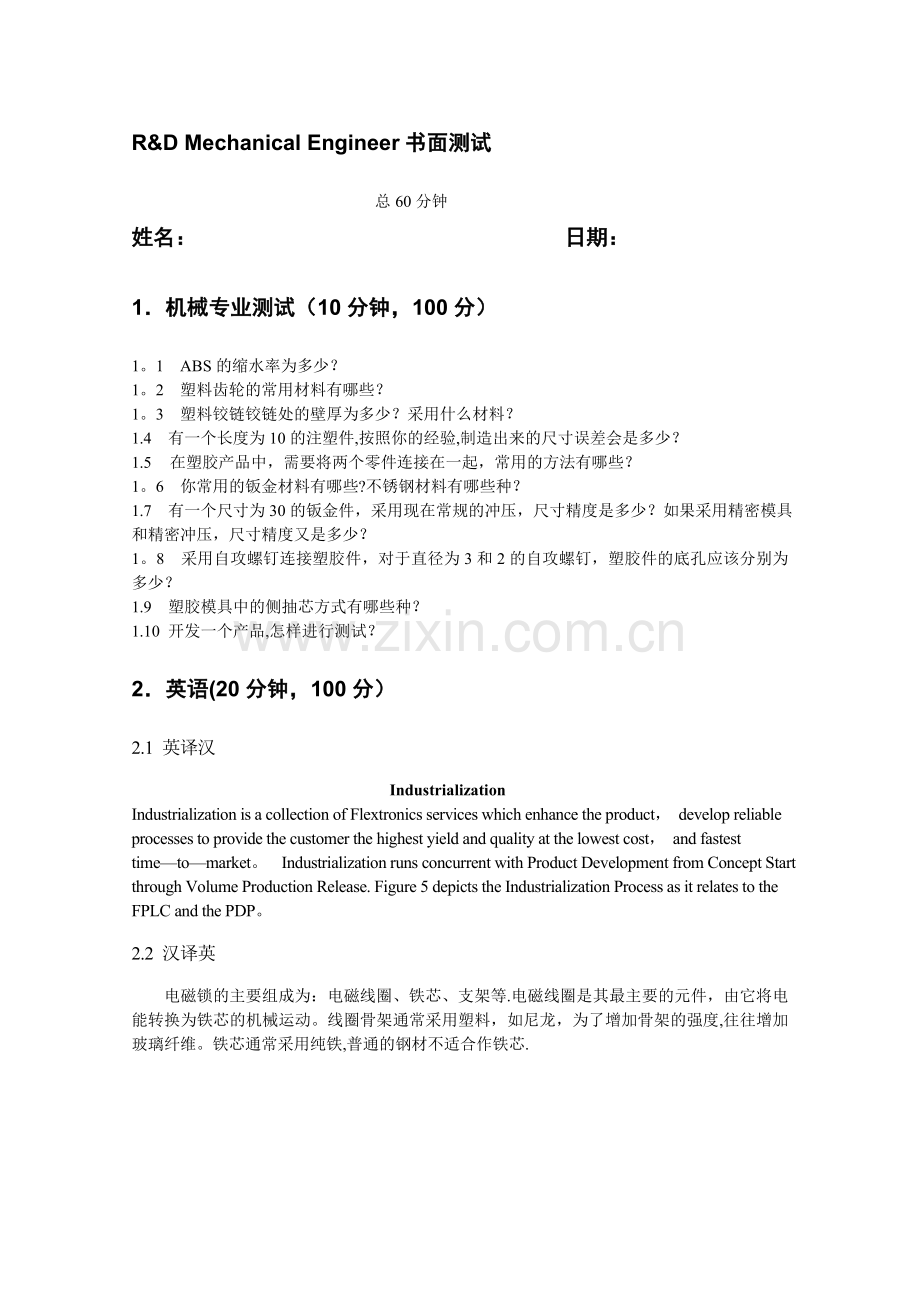 R&D Mechanical Engineer书面测试