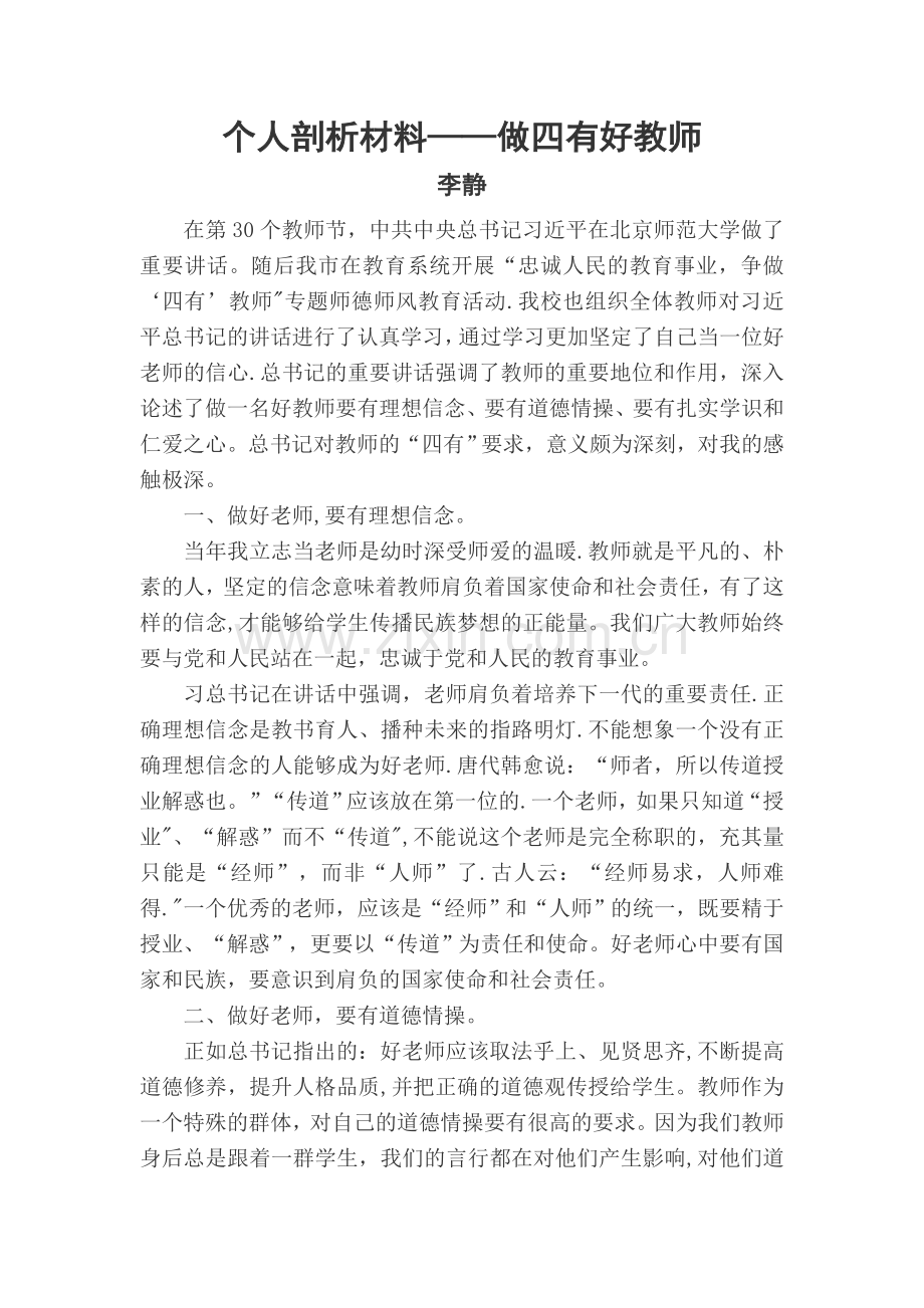 在第30个教师节,中共中央总书记习近平在北京师范大学做了重要讲话。随后我市在教育系统开展“忠诚人民的教育事业,争做‘四有’教师"专题师德师风教育活动.我校也组织全体教师对习近平总书记的讲话进行了认真学习,通过学习更加坚定了自己当一位好老师的信心.总书记的重要讲话强调了教师的重要地位和作用,深入论述了做一名好教师要有理想信念、要有道德情操、要有扎实学识和仁爱之心。总书记对教师的“四有”要求,意义颇为深刻,对我的感触极深。