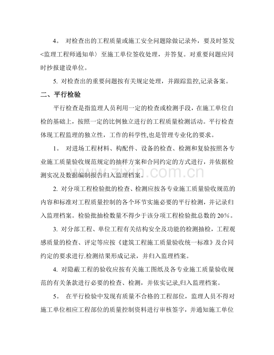 1. 施工过程分部分项工程及工序的质量检查与控制中监理人员必须做到对正在施工的作业区每日进行巡视检查.总监理工程师必须按计划定期组织各专业监理人员进行全面的拉网式巡视检查,形成制度化。