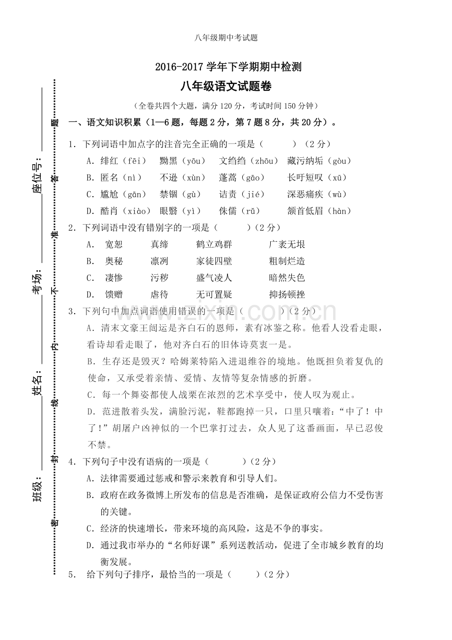一、语文知识积累(1—6题,每题2分,第7题8分,共20分)。