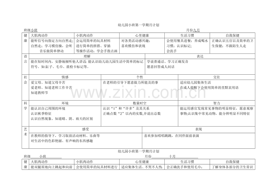 幼儿园小班第一学期月计划