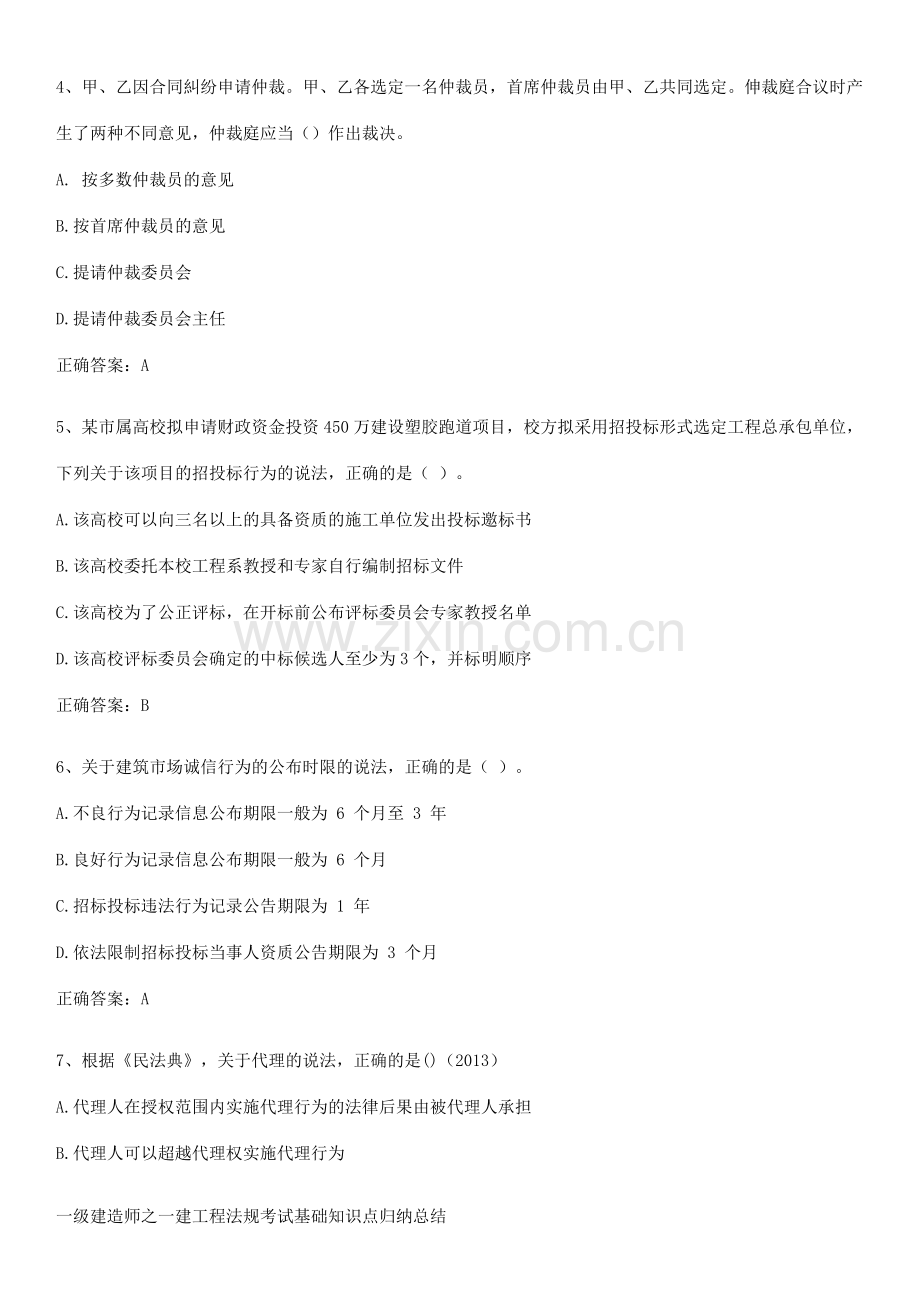 一级建造师之一建工程法规考试基础知识点归纳总结一级建造师之一建工程法规考试基础知识点归纳总结1、某起重机械设备安装单位投保了安装工程一切险,在机械设备安装过程中基于下列原因造成损失,其中应由保险公司承担损失的原因是()A.短路、过电压 B.材料瑕疵C.机械结构不合理D.战争、暴乱正确答案:D2、关于生产安全事故的报告和处理,下列说法中正确的有()。A.单位负责人应当于 2 小时内向安全生产监督管理部门报告 B.实行施工总承包的建设工程,由总承包单位负责上报生产安全事故 C.特别重大事故由国务院或其授权有关部门组织事故调查组进行调查 D.火灾事故造成的伤亡人数发生变化的,应当在 30 日内及时进行补报 E.事故发生地与事故单位不在同一地区的,由事故单位所在地人民政府调查正确答案:B3、民事纠纷的法律解决途径中,()是当事人根据在纠纷发生前或纠纷发生后达成的协议,自愿将纠纷提交第三方作出裁决,纠纷各方都有义务执行该裁决的一种解决纠纷的方式。A.和解B.调解C.仲裁D.诉讼正确答案:C一级建造师之一建工程法规考试基础知识点归纳总结4、甲、乙因合同糾纷申请仲裁。甲、乙各选定一名仲裁员,首席仲裁员由甲、乙共同选定。伸裁庭合议时产生了两种不同意见,仲裁庭应当()作出裁决。A.按多数仲裁员的意见 B.按首席仲裁员的意见C.提请仲裁委员会 D.提请仲裁委员会主任正确答案:A5、某市属高校拟申请财政资金投资 450 万建设塑胶跑道项目,校方拟采用招投标形式选定工程总承包单位,下列关于该项目的招投标行为的说法,正确的是()。A.该高校可以向三名以上的具备资质的施工单位发出投标邀标书B.该高校委托本校工程系教授和专家自行编制招标文件C.该高校为了公正评标,在开标前公布评标委员会专家教授名单D.该高校评标委员会确定的中标候选人至少为 3 个,并标明顺序正确答案:B6、关于建筑市场诚信行为的公布时限的说法,正确的是()。A.不良行为记录信息公布期限一般为 6 个月至 3 年B.良好行为记录信息公布期限一般为 6 个月C.招标投标违法行为记录公告期限为 1 年D.依法限制招标投标当事人资质公告期限为 3 个月正确答案:A7、根据民法典,关于代理的说法,正确的是()(2013)A.代理人在授权范围内实施代理行为的法律后果由被代理人承担B.代理人可以超越代理权实施代理行为一级建造师之一建工程法规考试基础知识点归纳总结C.被代理人对代理人的一切行为承担民事责任D.代理是代理人以自己的名义实施民事法律行为正确答案:A8、在房地产纠纷案件的审理中,关于承包人的建设工程价款优先受偿权,下列说法中正确的是()。A.承包人的优先受偿权优于抵押权和其他债权B.承包人的优先受偿权可以对抗已经交付全部房款的商品房买受人C.承包人因发包人违约所造成的损失,在工程拍卖款中优先受偿D.承包人行使优先受偿权的期限为建设工程竣工之日或者建设工程合同约定的竣工之日 6 个月内正确答案:D9、根据环境噪声污染防治法,在城市市区噪声敏感建筑物集中区域内,不能在夜间进行产生环境噪声污染的建筑施工作业的是()作业。A.抢修B.抢险C.抢工期D.生产工艺要求必须连续正确答案:C10、根据生产安全事故报告和调查处理条例,事故发生后,说法正确的是()。A.单位负责人接到报告后,应当于 2 小时内向有关部门报告B.单位负责人应当向单位所在地的有关部门报告C.事故现场有关人员应当在 1 小时内向本单位负责人报告D.情况紧急时,事故现场有关人员可以立即向有关部门越级报告正确答案:D一级建造师之一建工程法规考试基础知识点归纳总结11、绿色施工导则要求平面布置合理、紧凑,在满足环境、职业健康与安全及文明施工要求的前提下尽可能减少废弃地和死角,临时设施占地面积有效利用率大于()。A.60%B.70%C.80%D.90%正确答案:D12、当事人对人民法院委托的鉴定部门作出的鉴定结论有异议,不能作为申请重新鉴定理由的是()。A.鉴定机构或者鉴定人员不具备相应鉴定资格的B.鉴定程序严重违法的C.鉴定结论经过质证认定的D.鉴定结论明显依据不足的正确答案:C13、(2020 年真题)根据行政强制法,法律没有规定行政机关强制执行的,作出行政决定的行政机关应当申请强制执行的机关是()。A.人民法院B.人民政府C.公安机关D.监察机关正确答案:A14、根据民法典,下列财产不能作为抵押物的是()。A.厂房B.正在建设的建筑工程一级建造师之一建工程法规考试基础知识点归纳总结C.生产原材料D.公立幼儿园的教育设施正确答案:D15、某施工企业向某建筑材料供应商发出购买建筑材料的要约。该建筑材料供应商在承诺有效期内对该要约作出了完全同意的答复,则该买卖合同成立的时间为()。A.建筑材料供应商的答复文件到达施工企业时 B.施工企业发出订购建筑材料的要约时 C.建筑材料供应商发出答复文件时 D.施工企业订购建筑材料的要约到达建筑材料供应商时正确答案:A16、根据建筑法,在建工程因故中止施工的,建设单位应当自中止施工之日起()内,向施工许可证颁发机关报告,并按照规定做好建筑工程的维护管理工作。A.15 天 B.1 个月 C.2 个月 D.3 个月正确答案:B17、下列对合同分类的说法,错误的是()。A.加工承揽合同属于双务合同B.租赁合同属于诺成合同C.建设单位与商业银行的贷款合同属于单务合同D.自然人之间