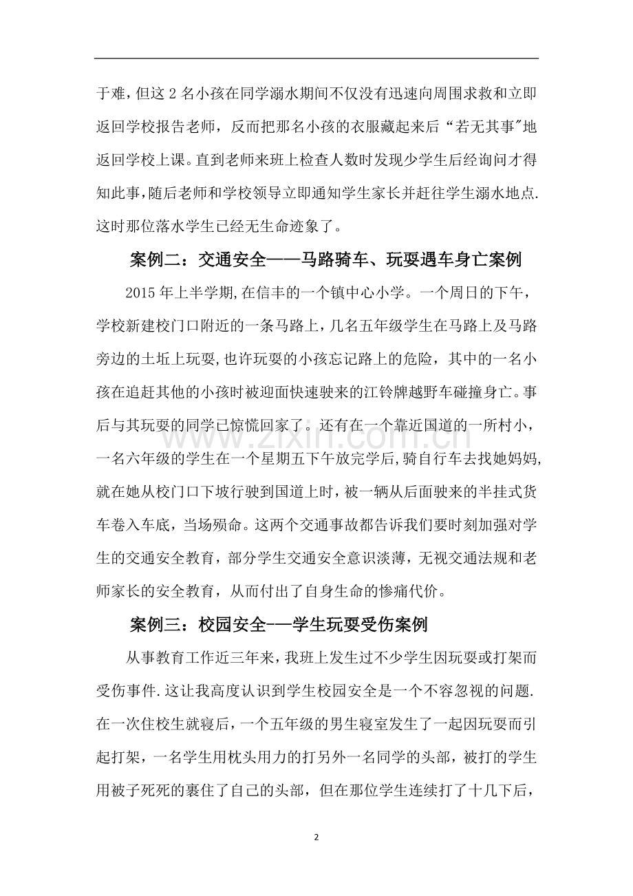 从事教育工作近三年来,我班上发生过不少学生因玩耍或打架而受伤事件.这让我高度认识到学生校园安全是一个不容忽视的问题.在一次住校生就寝后,一个五年级的男生寝室发生了一起因玩耍而引起打架,一名学生用枕头用力的打另外一名同学的头部,被打的学生用被子死死的裹住了自己的头部,但在那位学生连续打了十几下后,那位被打的学生虽用被子裹住头部但依旧受伤,头部起了一个碗口大的包,还被打得昏昏沉沉的,随后我同一位副校长送其去赣南附属医院第二院做检查并得出有轻微的脑震荡,事后两家在老师的协调下进行了协商赔偿,当询问那名打人的学生为什么打十几下时,他说:“他不知道枕头会打伤人,认为枕头很柔乱没事.”如此可见调皮的学生对这个安全问题认识不够,也告诉我们教师要密切注意学生的在校安全,切不可马虎大意。