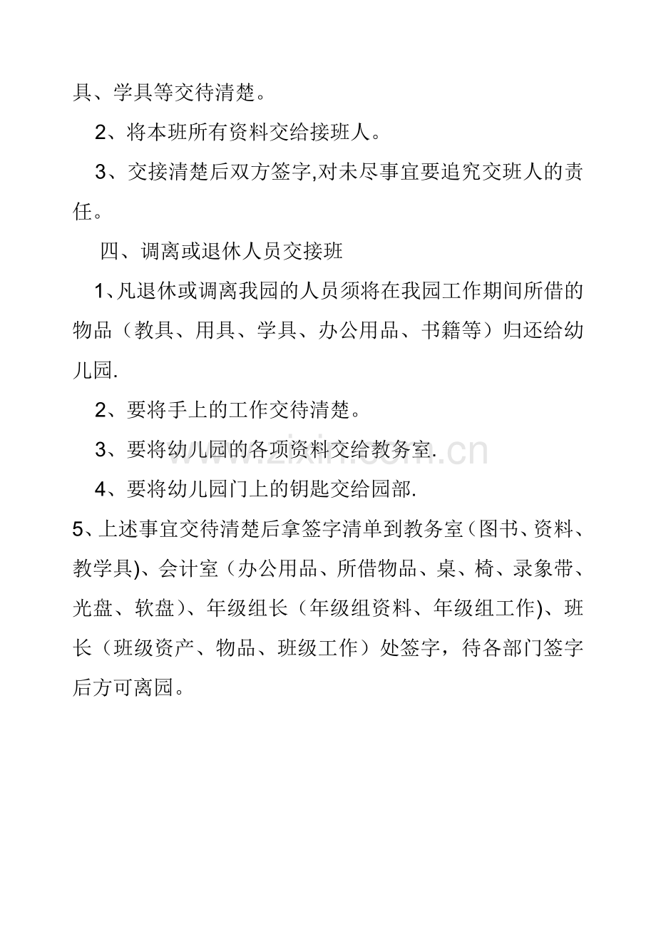 1、交班人须将本人所经手的资产、设备、钥匙、教学用具、学具等交待清楚。