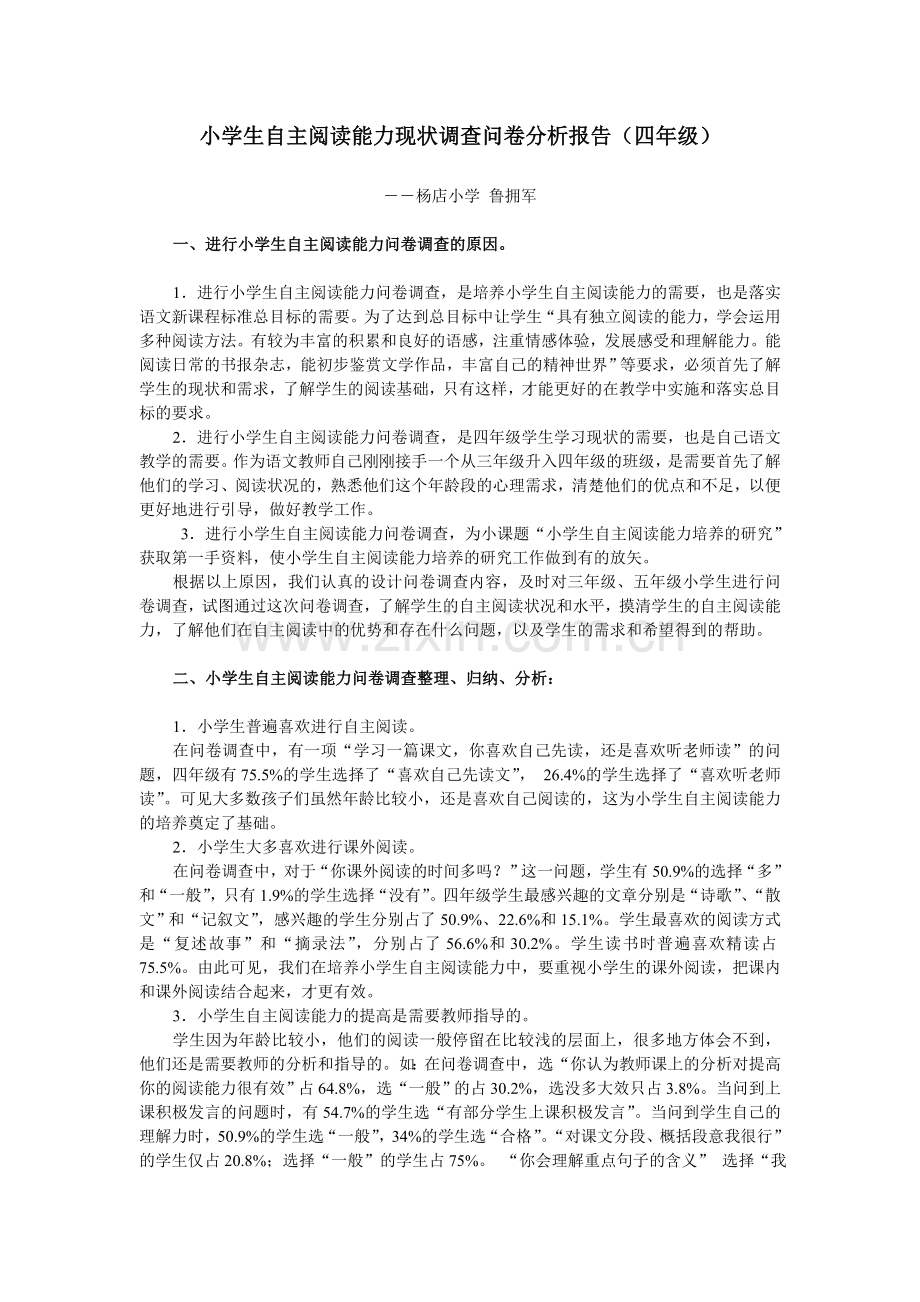 小学生自主阅读能力现状调查问卷分析报告(四年级)