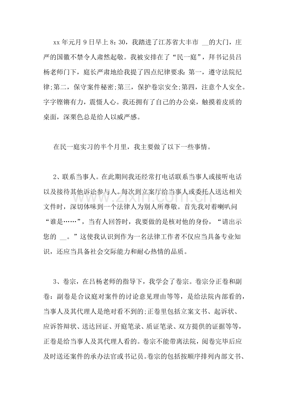 xx年元月9日早上8:30,我踏进了江苏省大丰市 __的大门,庄严的国徽不禁令人肃然起敬。我被安排在了“民一庭”,拜书记员吕杨老师门下,庭长严肃地给我提了四点纪律要求:第一,遵守法院纪律;第二,保守案件秘密;第三,保护卷宗安全;第四,注意个人安全。字字铿锵有力,震慑人心。我还拥有了自己的办公桌,触摸着皮质的桌面,深栗色总是给人以威严感。