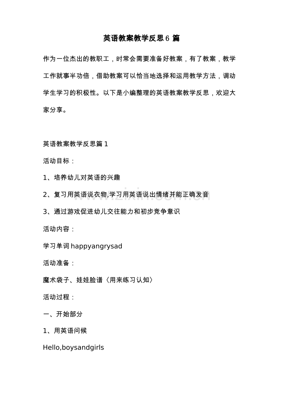 英语教案教学反思英语教案教学反思6 6 篇篇作为一位杰出的教职工,时常会需要准备好教案,有了教案,教学工作就事半功倍,借助教案可以恰当地选择和运用教学方法,调动学生学习的积极性。以下是小编整理的英语教案教学反思,欢迎大家分享。英语教案教学反思篇 1活动目标:1、培养幼儿对英语的兴趣2、复习用英语说衣物,学习用英语说出情绪并能正确发音3、通过游戏促进幼儿交往能力和初步竞争意识活动内容:学习单词 happyangrysad活动准备:魔术袋子、娃娃脸谱用来练习认知活动过程:一、开始部分1、用英语问候Hello,boysandgirlsHello,MissPan2、复习单词今天老师和小朋友们一起来回顾下衣服,Look,whatsthis?(有实物外套)幼:Itsacoat.师:Yes,verygood!Whatsthis?(有物件毛衣)幼:Itsasweater!师:Verygood!.Ok,看来小朋友都记得非常牢,真棒!来,咱们来唱首歌吧!OK?幼:OK!GO!(师幼共同唱音乐之声)二、学习新知识师:唱完歌,老师给小朋友们变个魔术!小朋友们肯定会喜欢的!一二三,变!小朋友们看,我现在很.?幼:很开心!在笑!(幼儿会有自己不同的回答)师:那现在呢?(教师可以逐一换面具,为了让幼儿区别情绪。幼儿也有自己做的面具可以小组进行识别或者让幼儿来教师身边示范识别。)在幼儿区别情绪的同时要代入英文,同步进行会比较好,让幼儿的印象更深刻。在学单词的时候不要枯燥的只是跟读,可以加入吹气球,坐过山车等声音控制大小游戏来增加趣味。happy 高兴的angry 生气的sad 伤心的三、游戏比赛记忆单词师:小朋友们真聪明!来!我们来鼓励下自己!伸出小手准备!Gugaga,gugaga,good,good,very,verygood!接下来咱们要进行一次竞赛咱们分第一,第二,第三,第四小组,看看谁是 NO.1!(教师讲解游戏玩法和规则,要求幼儿在最快时间内到教室的每个角落找表情面具,找到的用英语说出名字,每组每个小朋友要找到不同的表情。看哪组组合的最快,优胜组全班鼓掌鼓励。)四、结束活动师:小朋友,小娃娃脸真漂亮,他们要回家了,先和他们说再见吧幼:Good bye!Happy!Good bye!Angry!Good bye!Sad!Goodbye!五、活动自评通过本次英语活动,幼儿基本上可以掌握所学单词,并复习到一些简单的英语口语。活动通过听、说、学、用等多种游戏形式,使幼儿在玩中将所学知识得到巩固和使用,并能够在教师带动下积极参加到游戏中,并通过找朋友锻炼幼儿的交往能力,在游戏 中注意到幼儿的个体差异,及时鼓励和引导。英语教案教学反思篇 2教学目标1、能听、说、认读 bigsmalllongshort 四个形容词,了解 short的另一含义,并知其反义词 tall2、激发学生充分动用已学过的知识,进行发散性认识。3、学习句型 lookatthe,itis,并能进行创编,成一个新的 chant教学重难点重点1、听、说、认读几个形容词 small,big,long,short。2、运用所学过的知识,学说带有这些形容词的语句。难点1、单词small 中l 的发音,舌头要上卷。2、运用 bigsmalllongshort 四个形容词进行 创编,成一个新的chant教学工具多媒体教学过程1、WarmupletschantLookatthecat,itisfat.Lookatthepig,itisbig.Lookatthemonkey,itisfunny.Lookatthemouse,inmyhouse.ahhh!2、呈现新课(presentation)(1)教学bigT(出示一只大盒子):T oday,Iprepareagiftforyou.Look,whatsthis?Ss:Itsabox.T:Yes,itsabox,itsabigbox,thisboxisbig.出示单词卡,学习 big.BbbbigCAI(出示许多大的物品,让学生练说)abig_Lookat_.Itisbig._isbig.(2)教学smallT:Lookatthebigbox.Thereissomethinginit.Please,guesswhatsinit?Ss:.T:Look,itsabox,too.Itsasmallbox.Theboxissmall.出示单词卡,学习 smallsmallsmall操练:asmall_Lookat_.Itissmall._issmall.(3)CAI:Canyousay?_isbig,_issmall(4)教学longandshortT:Whatsinthesmallbox.Letmeopenitadsee.Oh,itsaruler.Itsashortruler.Therulerisshort.出示单词卡,学习 shortshortshortT:Thisrulerisamagicruler.Itcanturnlong,long,long.Let me say something to it”Long,long,long,makeyourselflong.Long,long,long,makeyourselflong.”(边说边将尺子变长了)Look,therulerislong,now.出示单词卡,学习 longlonglong出示一对铅笔,两束头发让他们作出变化short、longlong、short(5)描述短的钢笔,长的铅笔,并编成一个 chantshort,shortpen,thepenisshort,lookatthepen,itisshortlong,longpencil,thepencilislong,lookatthepencil,itislong(6)单词操练听录音,跟读用动作表演:看教师做、师生一起做、Letsdo(Big,big,big,makeyoureyesbig.Small,small,small,makeyoureyessmall.Long,long,long,makeyourarmslong.Short,short,short,short,makeyourarmslong.)、教师说,学生做找出反义词:教师向学生介绍这两对反义词(结合板书)、师生通过动作来表演反义词、CAI 连线3、拓展与延伸(1)教学单词tallCAI:以 short 的一封信引入,学习 tall,并在班级中找 出 Whoisshort?Whoistall?、Let,sdo(T all,tall,tall,makeyourselftall.Short,short,short,makeyourselfshort.)(2)仿编chant4、Homework1、Readthedialogue3times.2、Shareyourpicturetoyourfriends.课后小结本堂课的教学内容选自 PEP 小学英语教 材四年级上册 Unit6PartALetslearn和Letsdo。通过本课时的学习,要求学生能够熟练掌握四个新授单词:long,short,big,small。在此基础上要求学生能够听懂 Letsdo 中的指令性语言,并做出相应的动作。本课的教学 重点 是四个单词的理解和 掌握,以 及 让学生用 句 子“Itsbig/small/long/short.Ithasalong/shorttail”对相应的人或物的大小长短做出正确的描述。为了达到以上教学目标,我把课堂分成两部分:long/short 的学习以及,big 和 small 的学习。按照整体设计思路:实物呈现、操练、情景操练、表演、chant 的过程,首先通过动物图片引出兔子玩偶,两个大小不同的兔子引出 big 和 small。并通过实